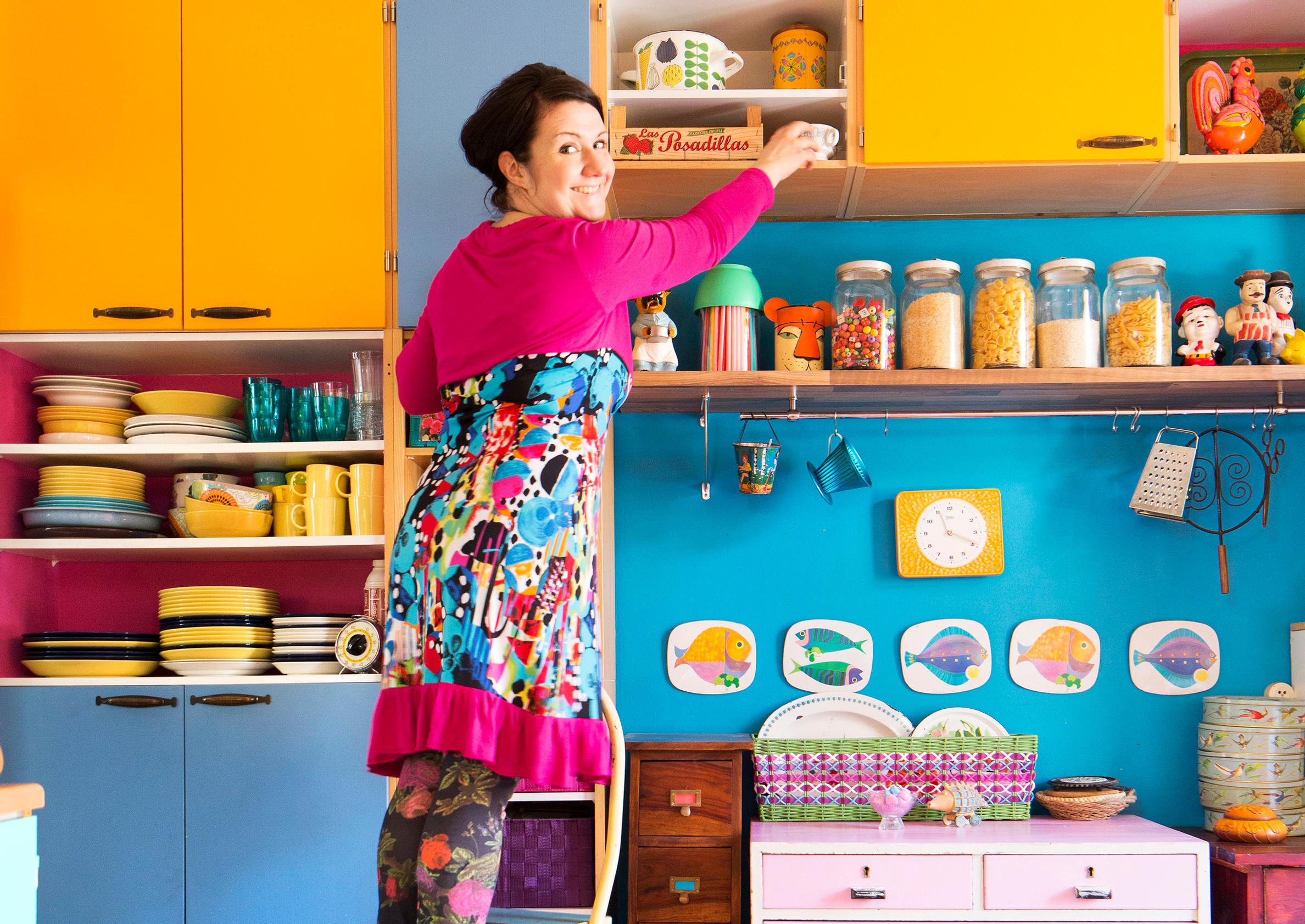 Muutama vuosi sitten hän alkoi maalata keittiökaapiston ovia lämpimän keltaisiksi. Parista ovesta tuli sininen, mutta vieläkin näytti laimealta. Hän lisäsi vähän purppuranpunaista, ja valmista tuli!