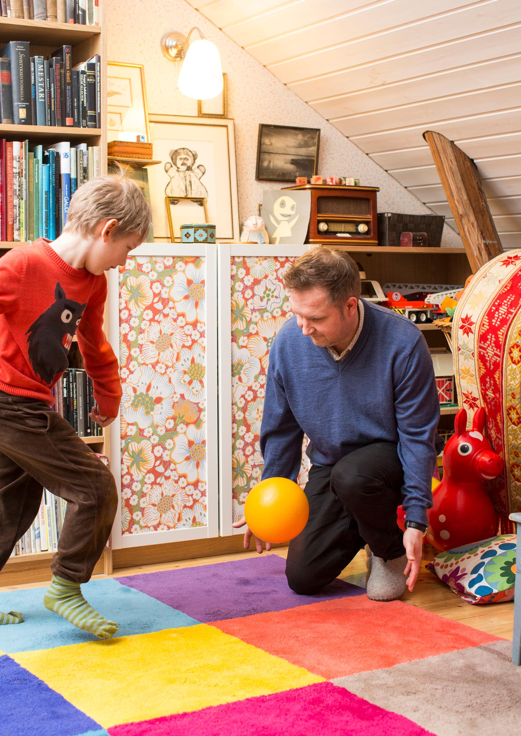 Petra on sekä lastenkirjailija että kuvataiteilija, ja hän myös opettaa kuvataiteita. Rakkaus väreihin näkyy kaikkialla kodissa. Sisustusratkaisut ovat luovia ja omaperäisiä.