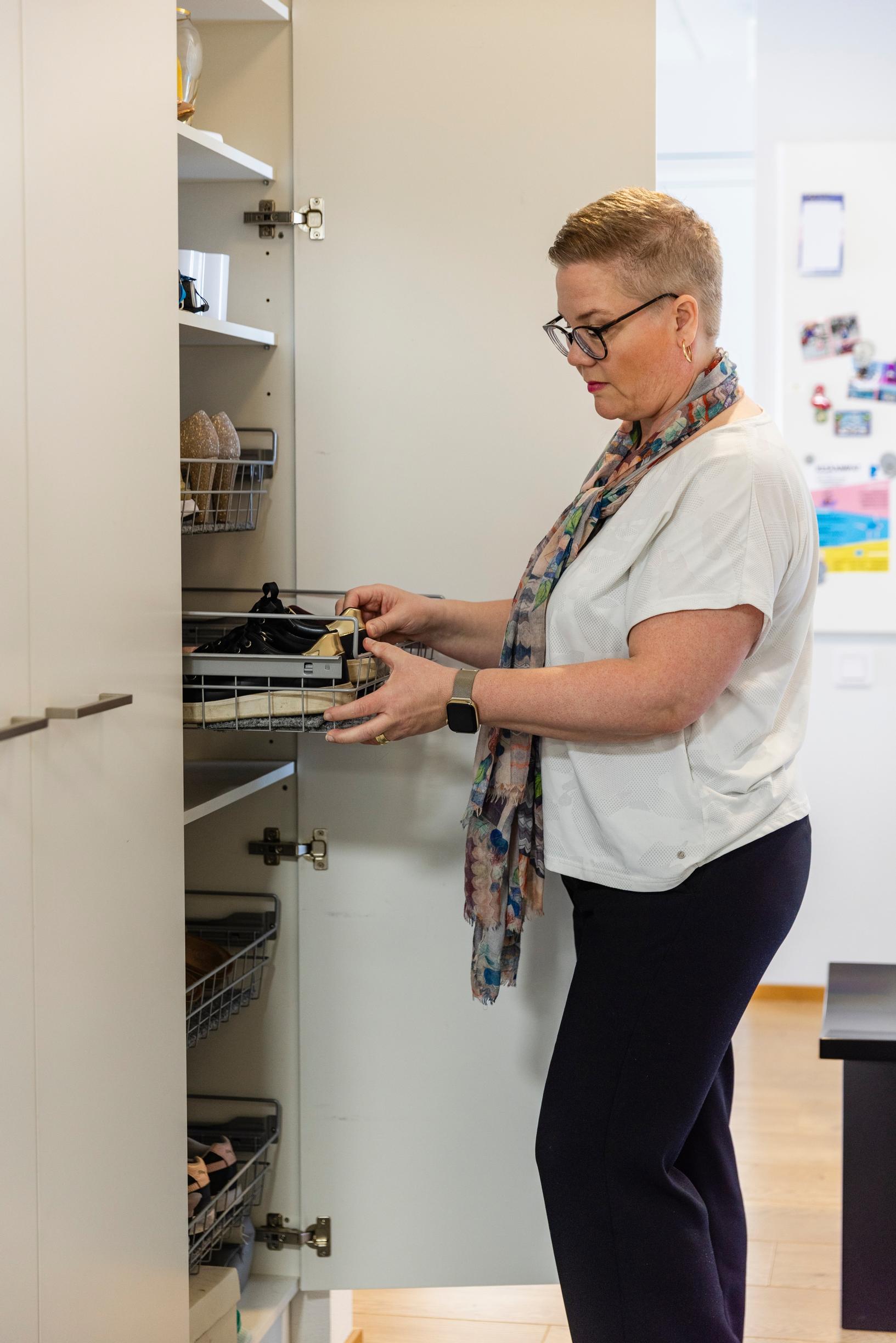 ”Mielestäni eteisessä kaikki tila tarvitaan kengille, vaatteille ja ehkä myös laukuille. Kengille eteiskaapissa on metallilankakoreja, jotka kulkevat kiskoilla. Niissä ilma kiertää, kenkiä mahtuu useita pareja eikä taakse jää tyhjää tilaa. Lapsiperhevuosina asensimme ison henkarikaapin alaosaan metallilankahyllyt koko kaapin mitalta. Jos kaapin lattiassa ei ole lämmitystä, kuramatto pohjalla pitää tilan siistinä.”