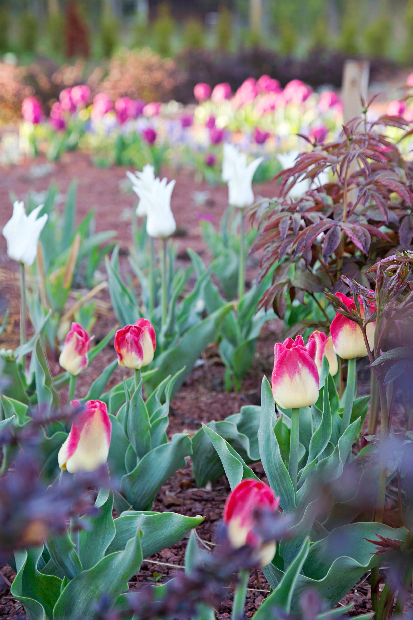 Keväällä erilaiset sipulikukat ovat pääroolissa. Niitä on kaikkiaan noin 100 000. Hyasintit ja osa helmililjoista ja muistakin pienistä sipulikukista ovat jo kuihtuneet, nyt kesäkuun kynnyksellä show’ta johtavat värikkäät ja kookkaat tulppaanit.