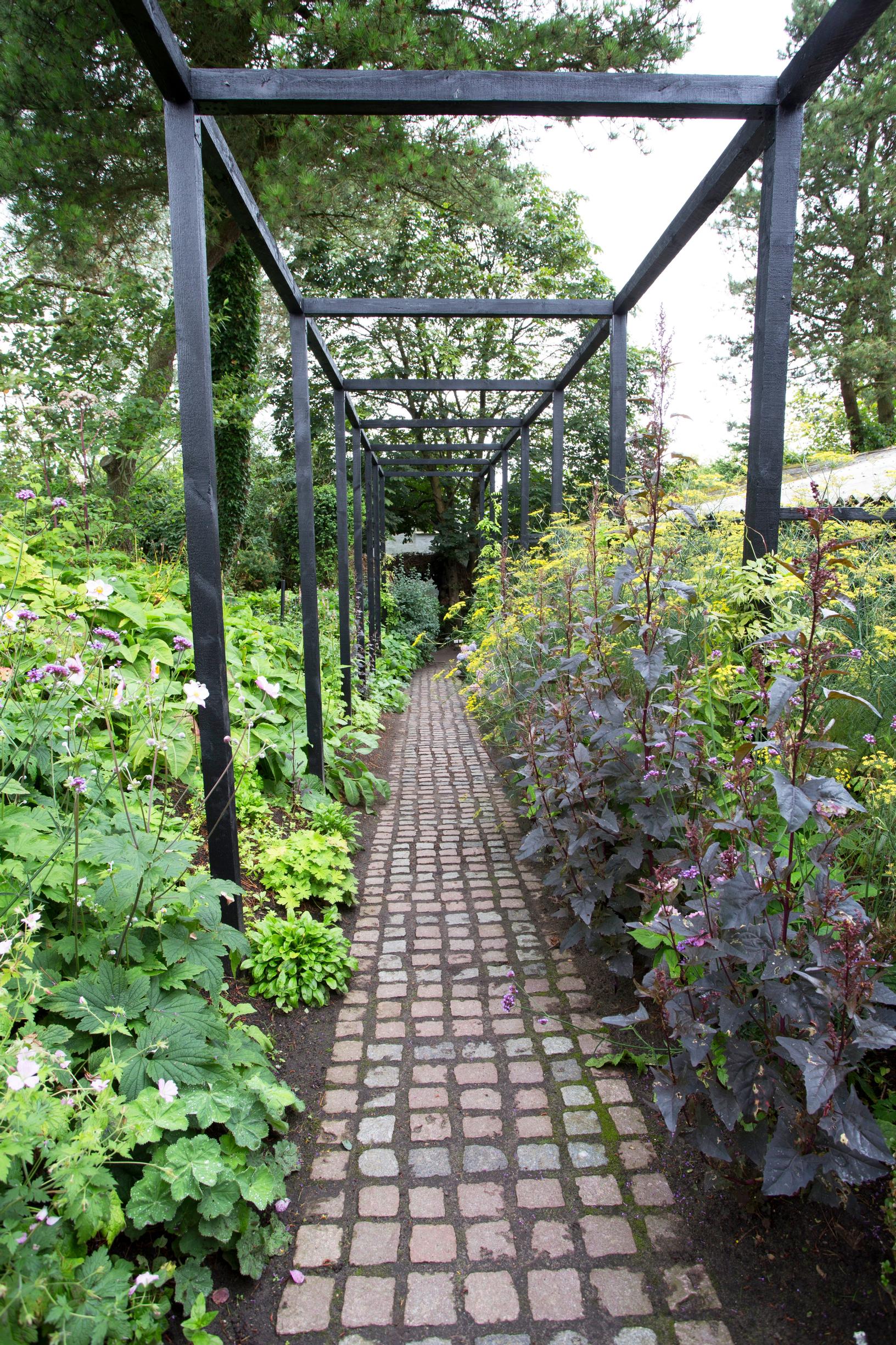 Symmetrinen pergolakäytävä ohjaa kulkijan päättäväisesti haluttuun suuntaan huone kerrallaan paljastuvassa puutarhassa. Selkeän geometriset linjat rauhoittavat nyt jo edesmenneen tanskalaisen kukkataiteilijan Anne Justin ja hänen arkkitehtimiehensä Claus Bonderupin luomaa yltäkylläistä puutarhaa. Pergolan päällä kiipeilee kesän alussa kukkiva sinisade.