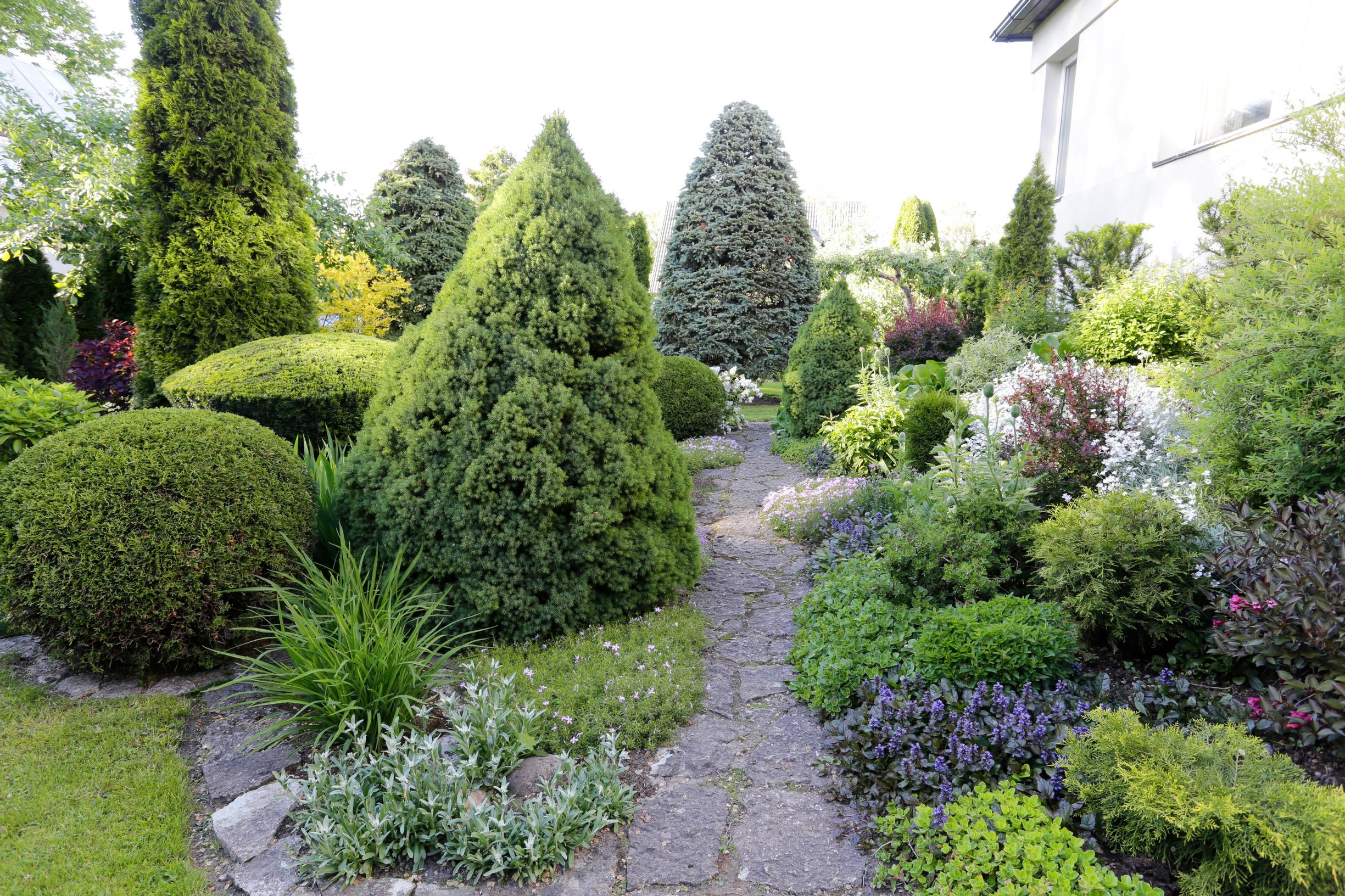 Oletko hurahtanut pensaisiin ja perennoihin niin, että nurmikon osuus pihastasi vähenee vuosi vuodelta? Tervetuloa joukkoon! Onneksi nurmialueen voi rajata niin kapeaksi, että se muistuttaa istutusalueiden väliin jäävää polkua. Jos haluat pitää nurmen reunat näin siistinä, varaudu kanttaamaan ne pari kertaa kesässä. Tuijien lomassa kasvavat muun muassa punalehtinen peruukkipensas ja lännenheisiangervo ’Diabolo’, laikkukirjokanukka sekä kalliovuortenkataja ’Blue Arrow’.