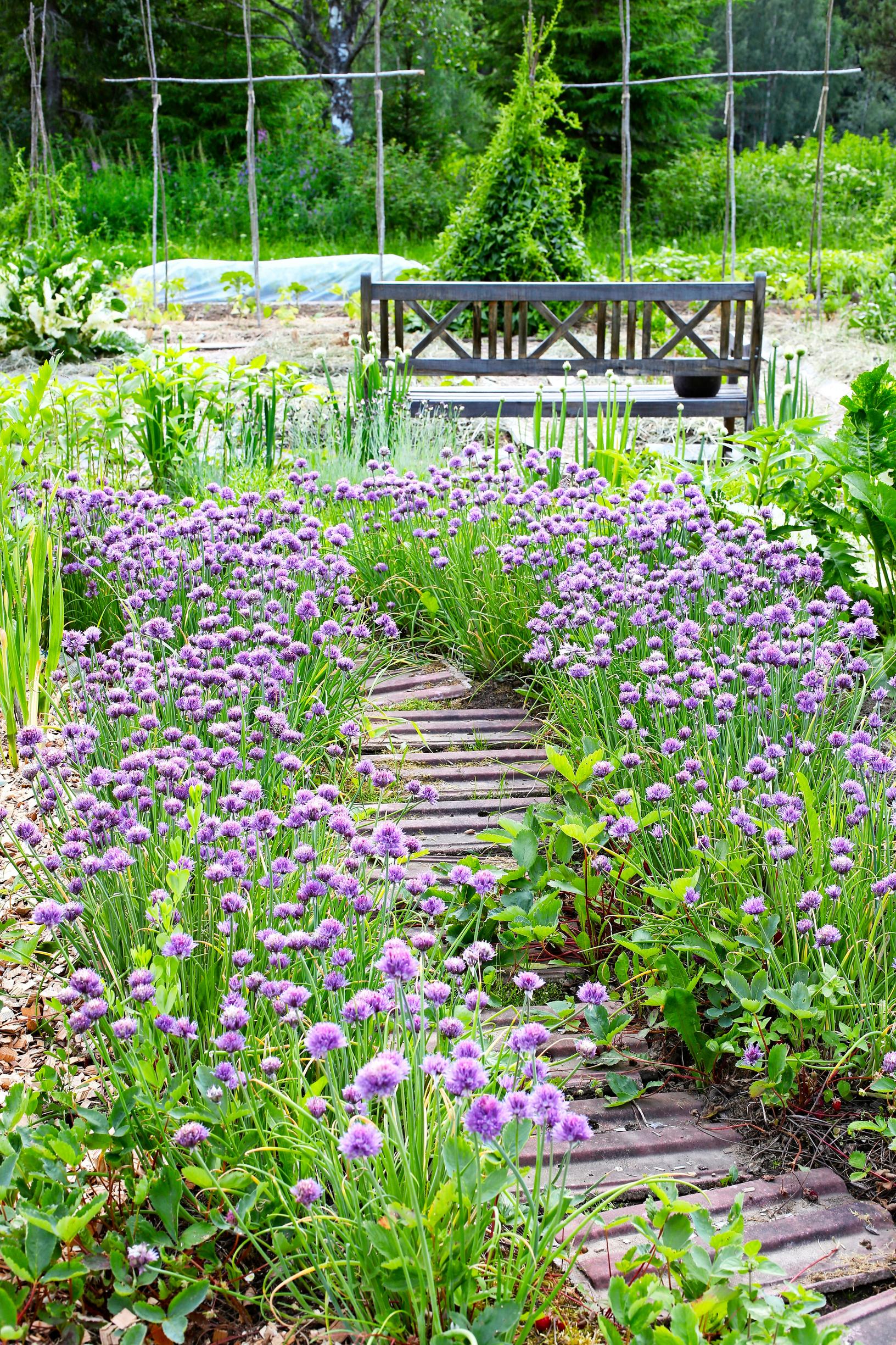 Joskus kaunein kulkuväylä syntyy ilmaiseksi ja suuremmin rehkimättä.Tässä keittiötarhassa poluksi ovat päätyneet vanhat navetan kattotiilet. Hurmaavan polun ruohosipulireunukset on tehty jakamalla yhdestä ainoasta sipulimättäästä. Samantyyppisen polun voisi toteuttaa myös vanhoista lankuista.