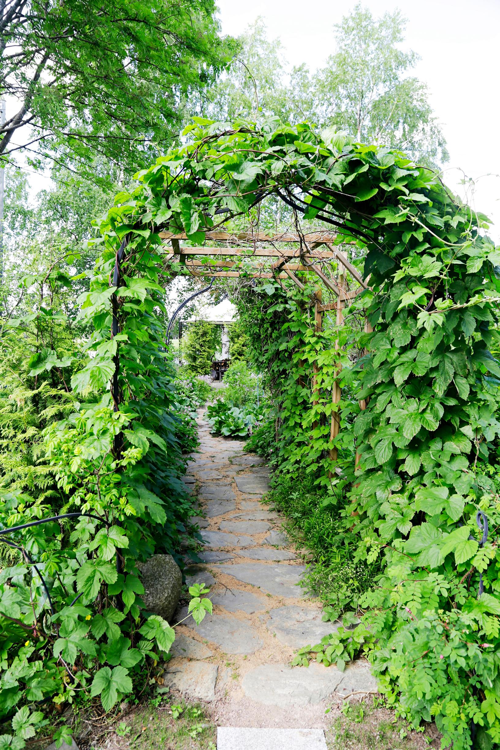 Köynnöskaarista voi loihtia kokonaisen tunnelin asettamalla niitä useita peräkkäin. Monivuotinen, ruohovartinen humala kiipeää vikkelästi seiniksi ja katoksi. Romanttista kukkakäytävää halajava valitsee esimerkiksi lumikärhön, ruotsinköynnöskuusaman, köynnöshortensian tai tarhahelenanruusu ’Lykkefundin’. Liuskekivi sopii lattiaksi moneen puutarhatyyliin.