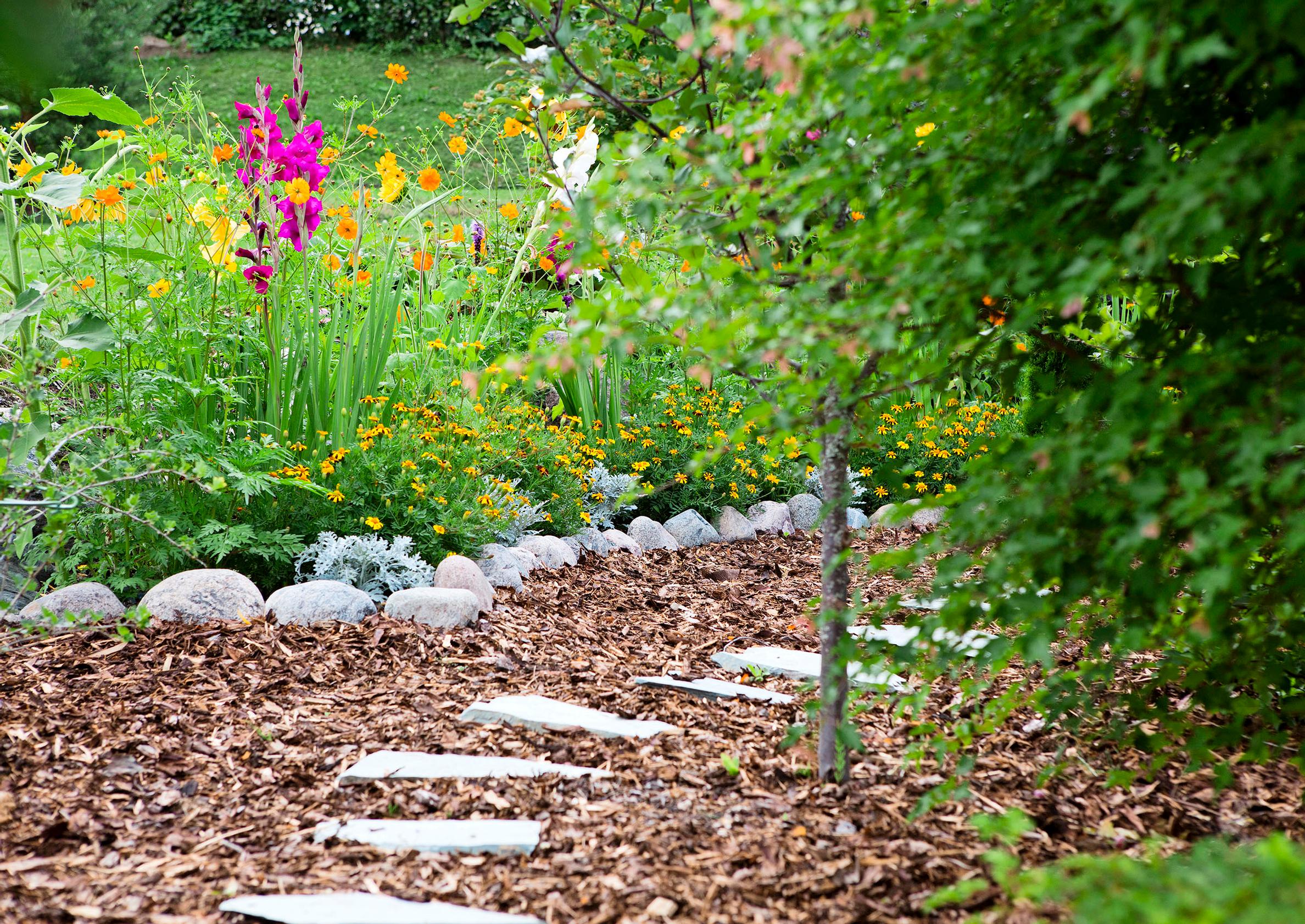 Puutarhan polut voit päällystää myös hakkeella. Kuorikate suojaa maan pintaa kuivumiselta ja liettymiseltä. Se parantaa maan kosteusoloja. Jos hake tuntuu liian karkealta jalan alla, voit asetella astinkivet liuskekivi- tai betonilaatoista suoraan katteen päälle. Asettele laatat uudelleen keväällä, kun levität uuden hakekerroksen vanhan päälle. Typpilannoituksen lisäys aika ajoin parantaa kasvien viihtymistä, sillä hake kuluttaa maatuessaan typpivaroja.