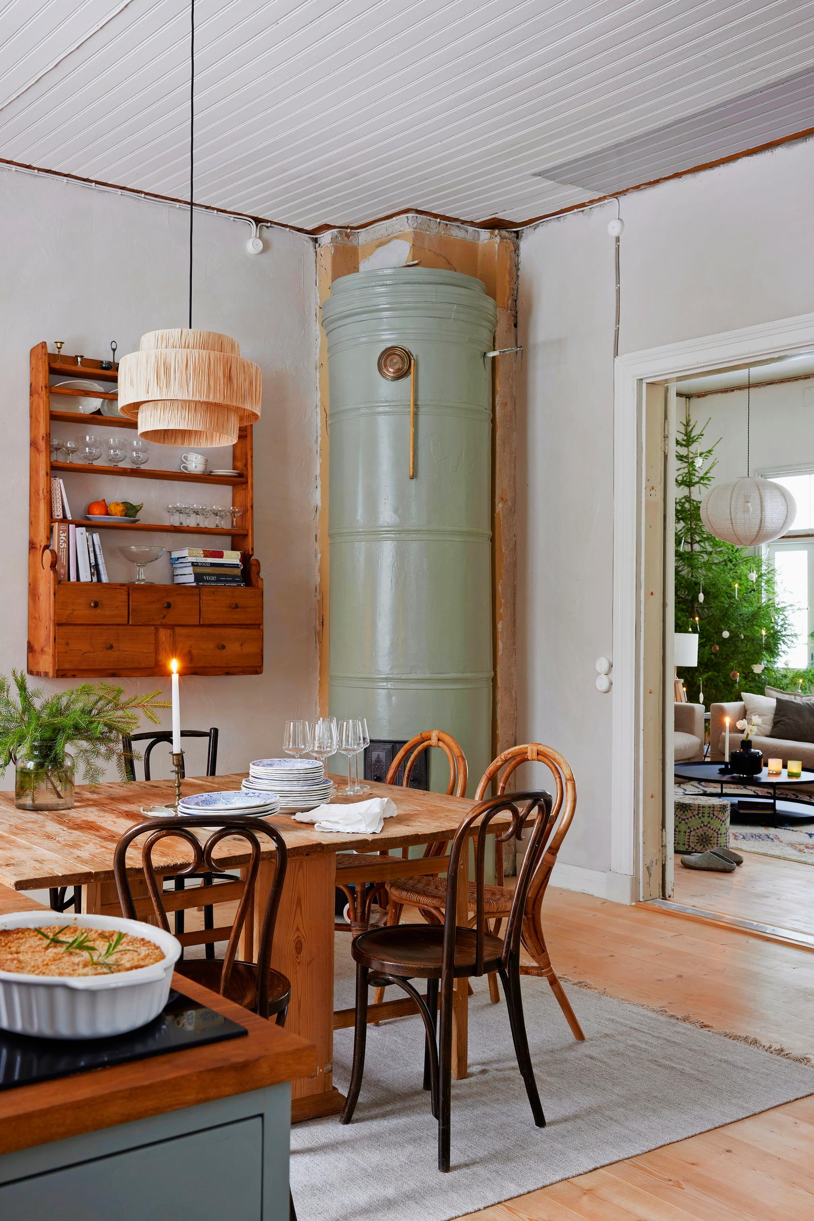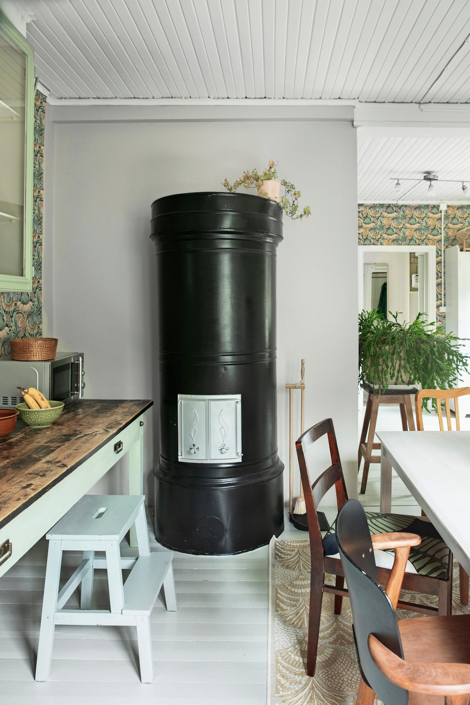 Yli satavuotiaan entisen kansakoulun ruokailutilaan lämpöä ja tunnelmaa tuo pönttöuuni, jonka sävy toistuu vastapäisessä antiikkikaapissa.