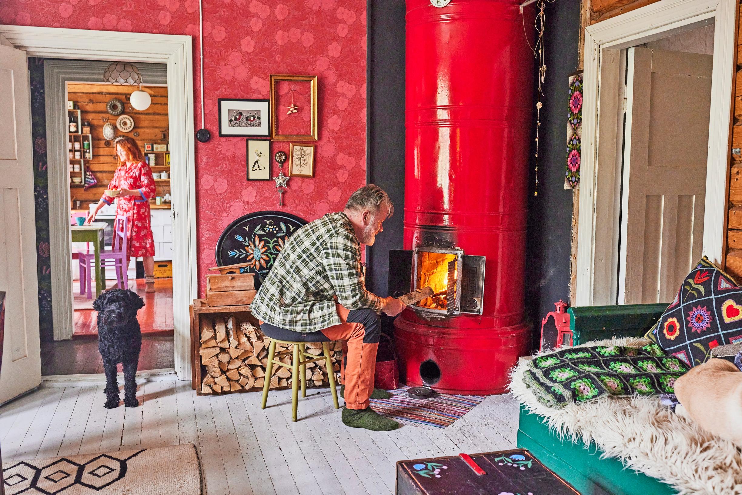 Arja Heinilän ja Ilkka Peräojan vanhaan kauppaan remontoidun kodin jokaisessa huoneessa on pönttöuuni. Olohuoneen pönttis on kiiltävän punainen.