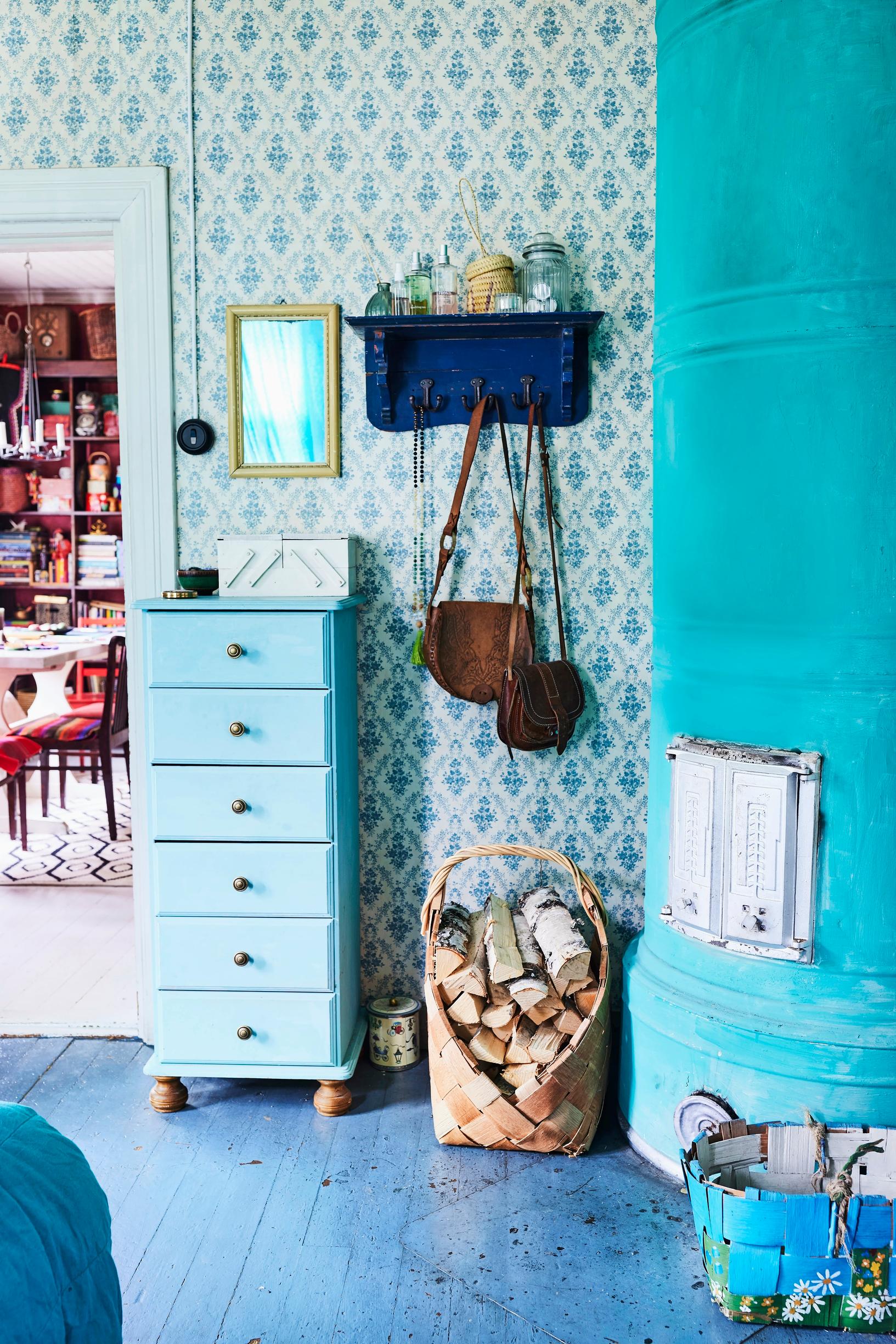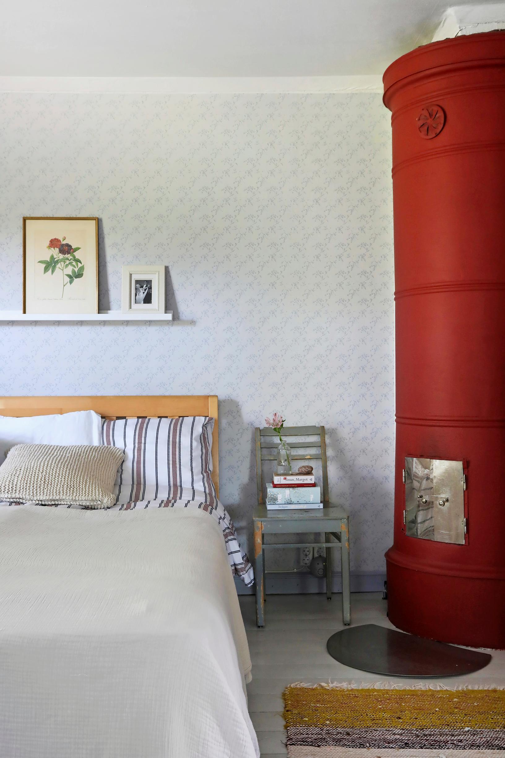 Vanhan talon makuuhuoneen värityksen määritteli tapetti. Pönttöuunikin sai pintaansa Välimeren turkoosin maalin.