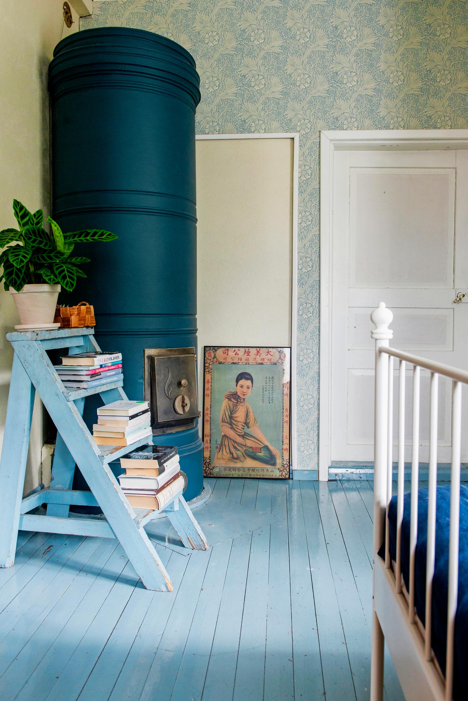 Villa Ratulan makuuhuoneen pönttöuunista tuli kuninkaallisen sininen, sävy on Tikkurilan M436 Royal. Hennommat sinisen sävyt toistuvat lattiassa, jakkarassa ja tapetissa.