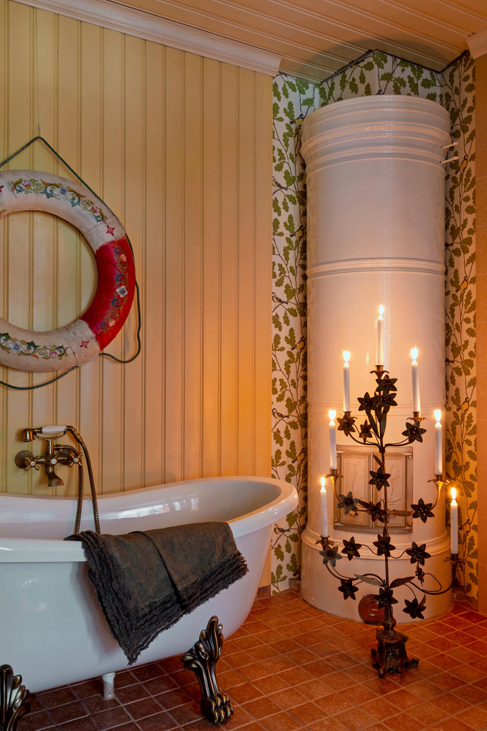 Pönttöuuni tassuammeen vieressä on jo melkein liian ihanaa! 1800-luvulla rakennetun maalaistalon tilavassa kylpyhuoneessa ei palele talvellakaan.