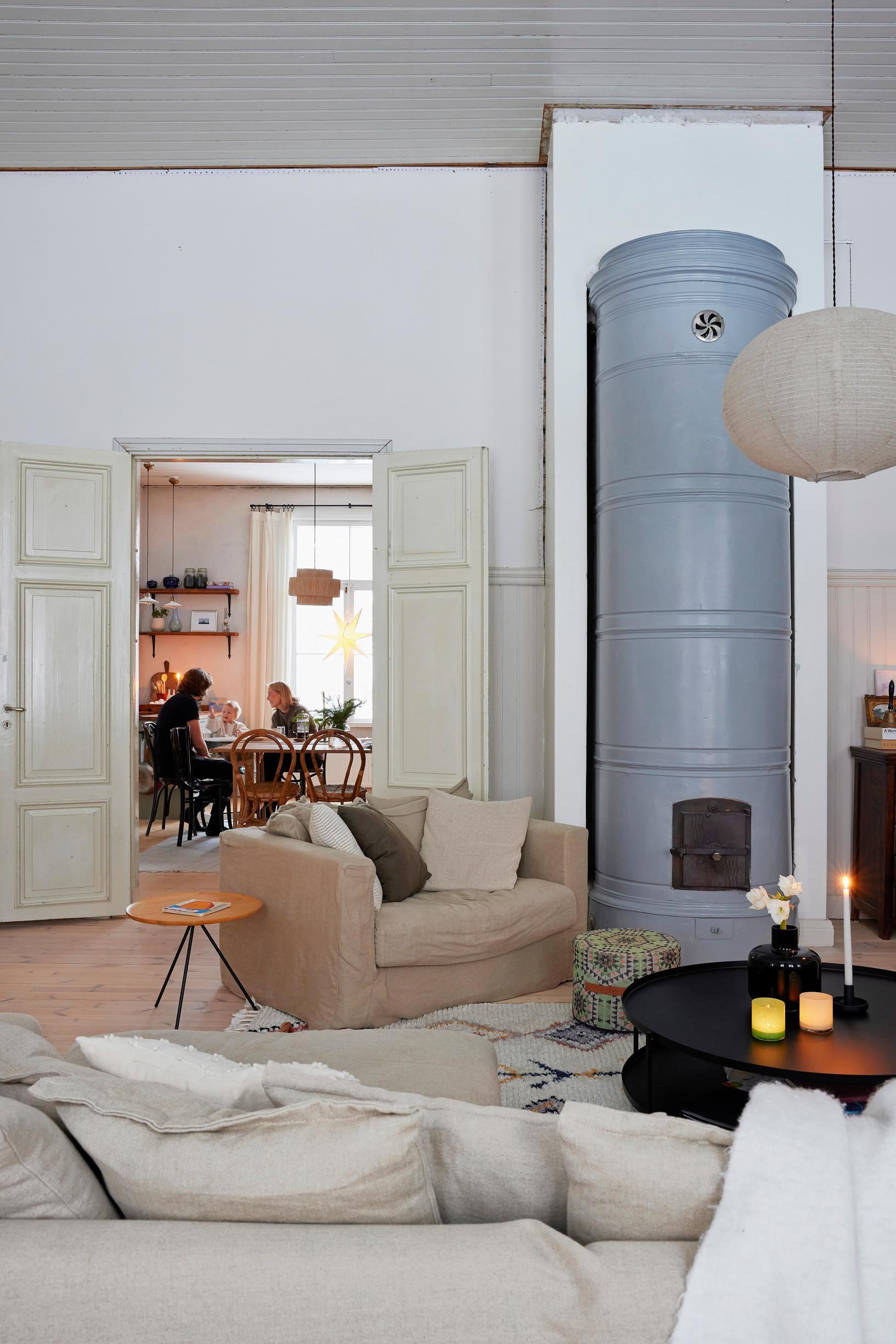 Villa Ekkulla on tehty entiseen kansakouluun. Sen valtavaa olohuonetta, entistä jumppasalia, lämmittää kauniin siniharmaa pönttöuuni.