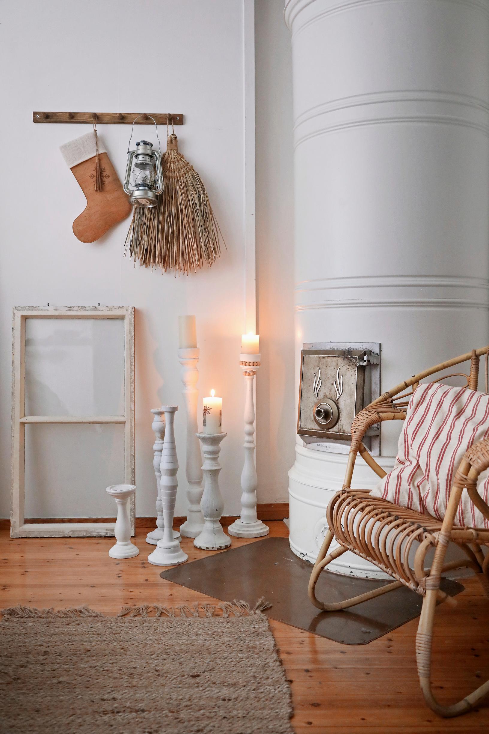 1920-luvun puurivitalon pönttöuunit saivat Jemina Hakkaraisen ihastumaan asuntoon. Joulunaikaan uunit somistetaan tunnelmaan sopiviksi.