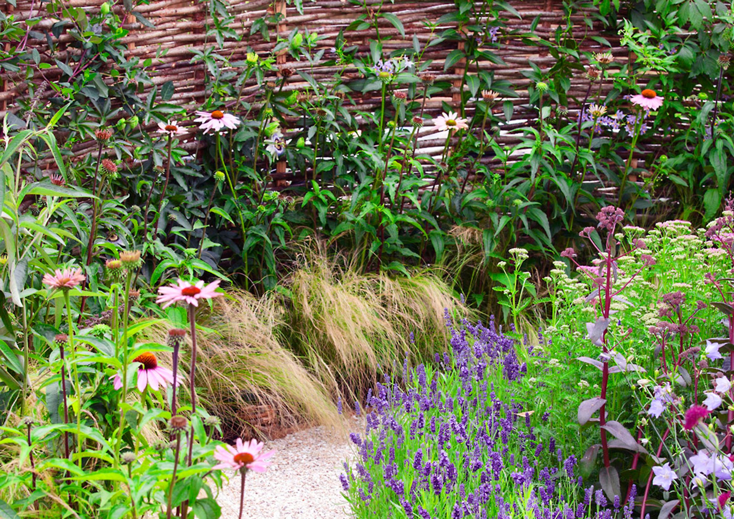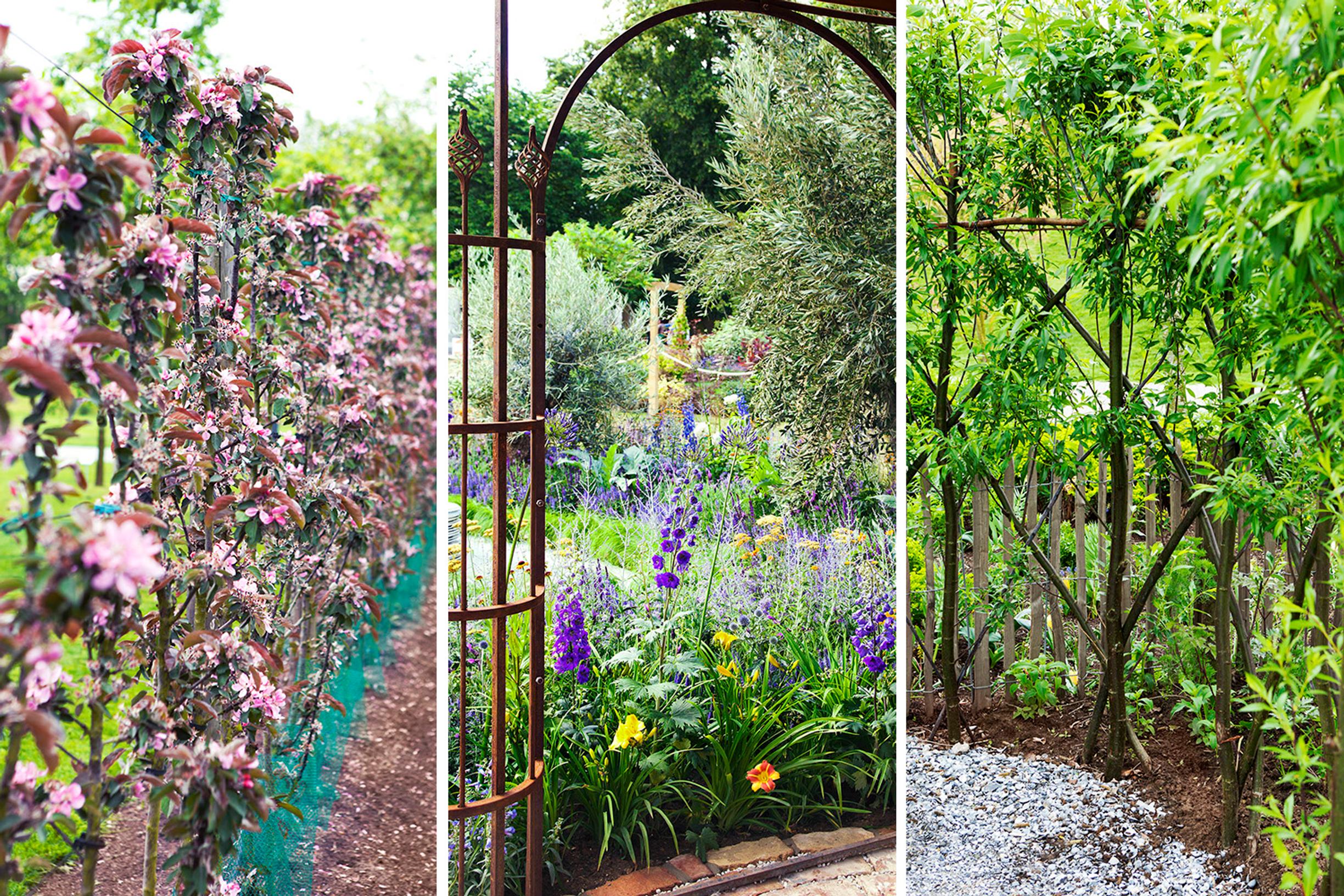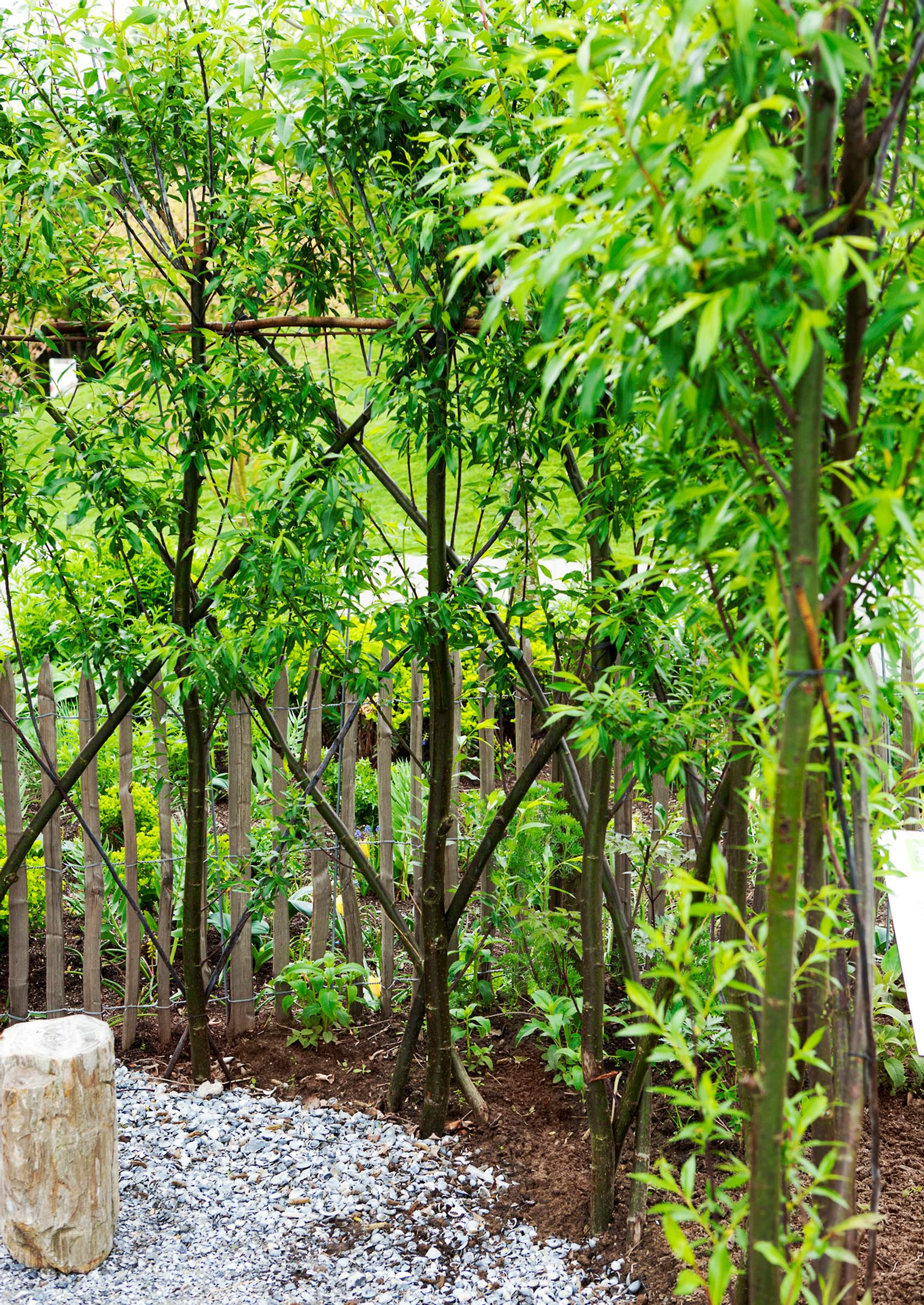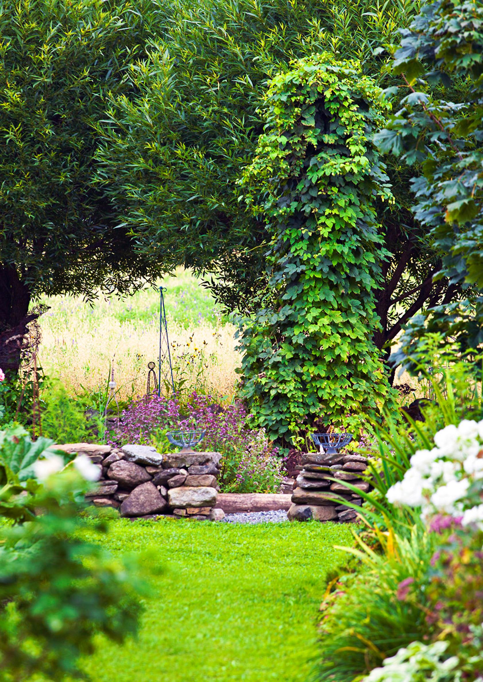 Matala aidan yli näkee pilkahduksen takanaan häämöttävästä yrttitarhasta. Terijoensalavien latvukset suojaavat puutarhaa katseilta ja tuulilta. Runkojen lomasta avautuva peltonäkymä on kiehtova yksinkertaisuudessaan. Jos puutarhaa ympäröi kaunis maisema, ei sitä pidä rajata pois tiiviillä istutuksilla. Ota ympärillä lainehtiva viljapelto osaksi puutarhaa ja nauti sen vaihtuvista väreistä. Sijoita penkki puun juurelle ja anna katseen vaeltaa avarassa maisemassa.