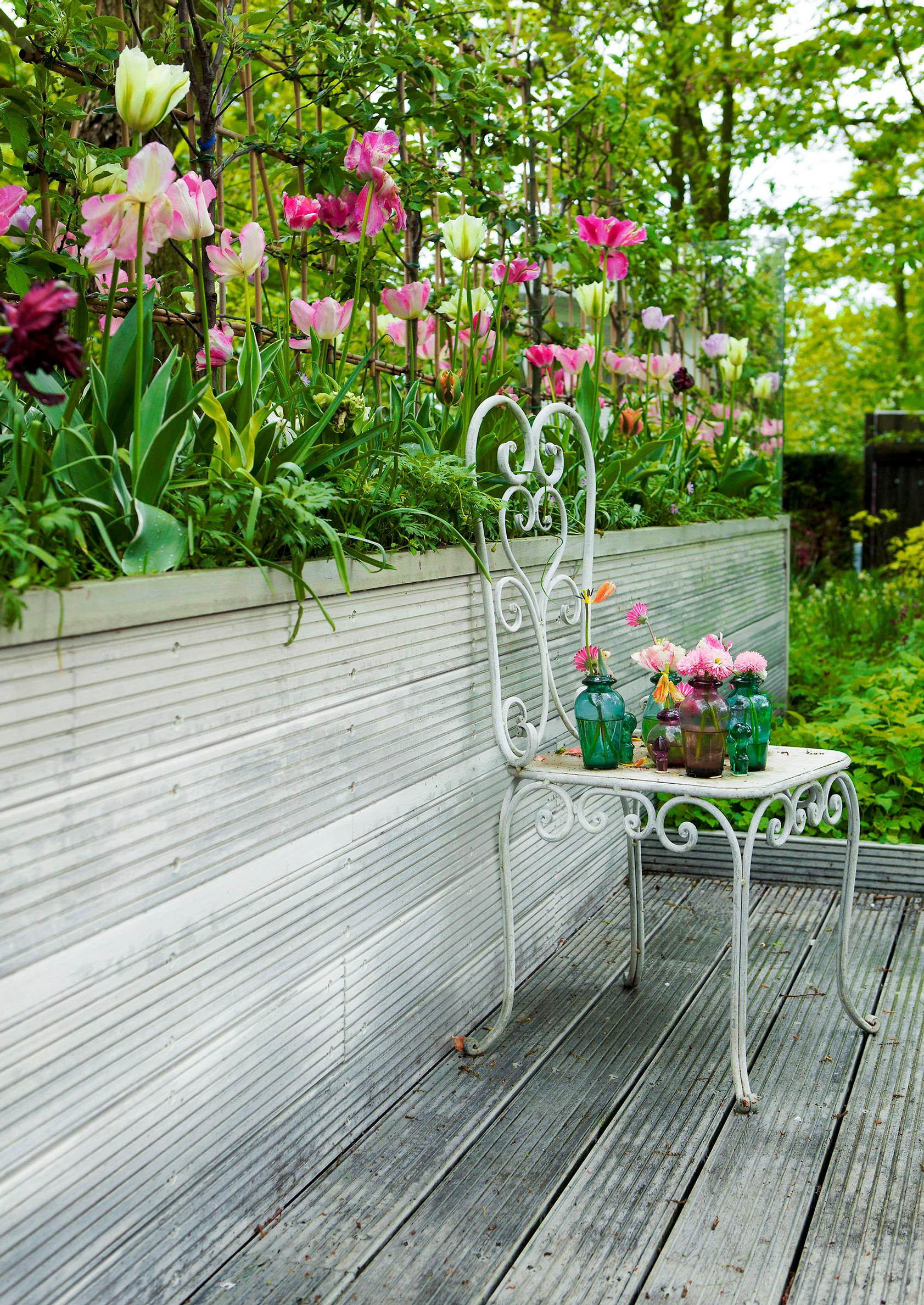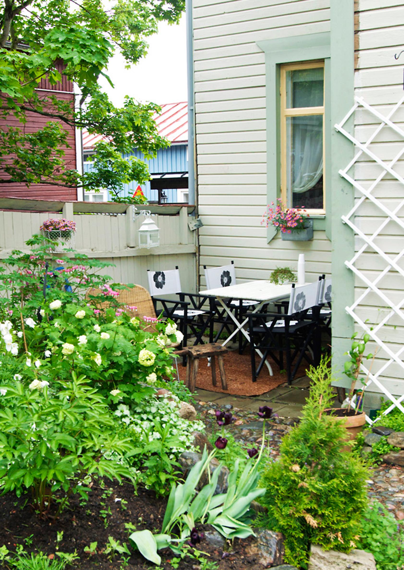 Lauta-aita luo näkösuojaa ja yksityisyyden tuntua tiiviissä puutalokorttelissa. Se suojaa liikenteen kumulta ja ohikulkijoiden katseilta. Onni voi olla suojainen oleskelutila keittiön ikkunan alla, rakennuksen kainalossa. Pihapuu siivilöi auringon valon, eikä päivänvarjoa tarvita. Talon väriin sointuvat kalusteet tekevät oleskelutilasta harmonisen, ja kukkien lempeät sävyt viimeistelevät romanttisen tunnelman.