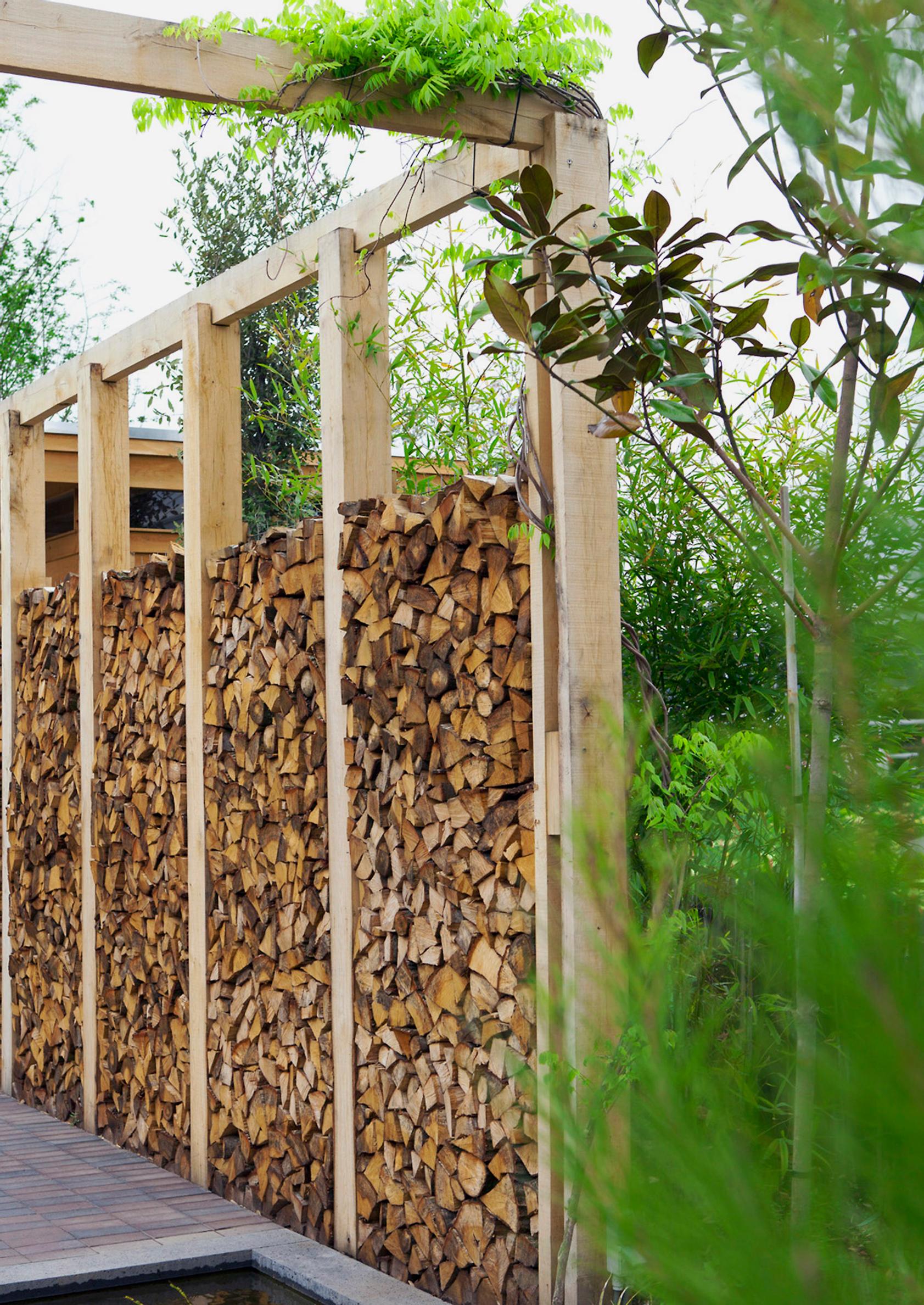 Huumoria vai hyötyä? Takkapuut voi kuivattaa näinkin: pinoa tuoreet klapit keväällä kuivumaan ja korjaa kuivat puut syksyllä varastoon. Rakennelmasta saa kätevän näkösuojan ainakin uudella pihalla, jonka nuori kasvillisuus ei vielä anna minkäänlaista yksityisyyttä pihalla istujille. Voit myös jättää klapiseinän pysyväksi rakenteeksi, joka suojaa oleskelutilaa katseilta ja ääniltä. Luonto kiittää ratkaisusta, sillä puiden raoista pihan hyötyhyönteiset löytävät ruhtinaallisesti pesä- ja piilopaikkoja.