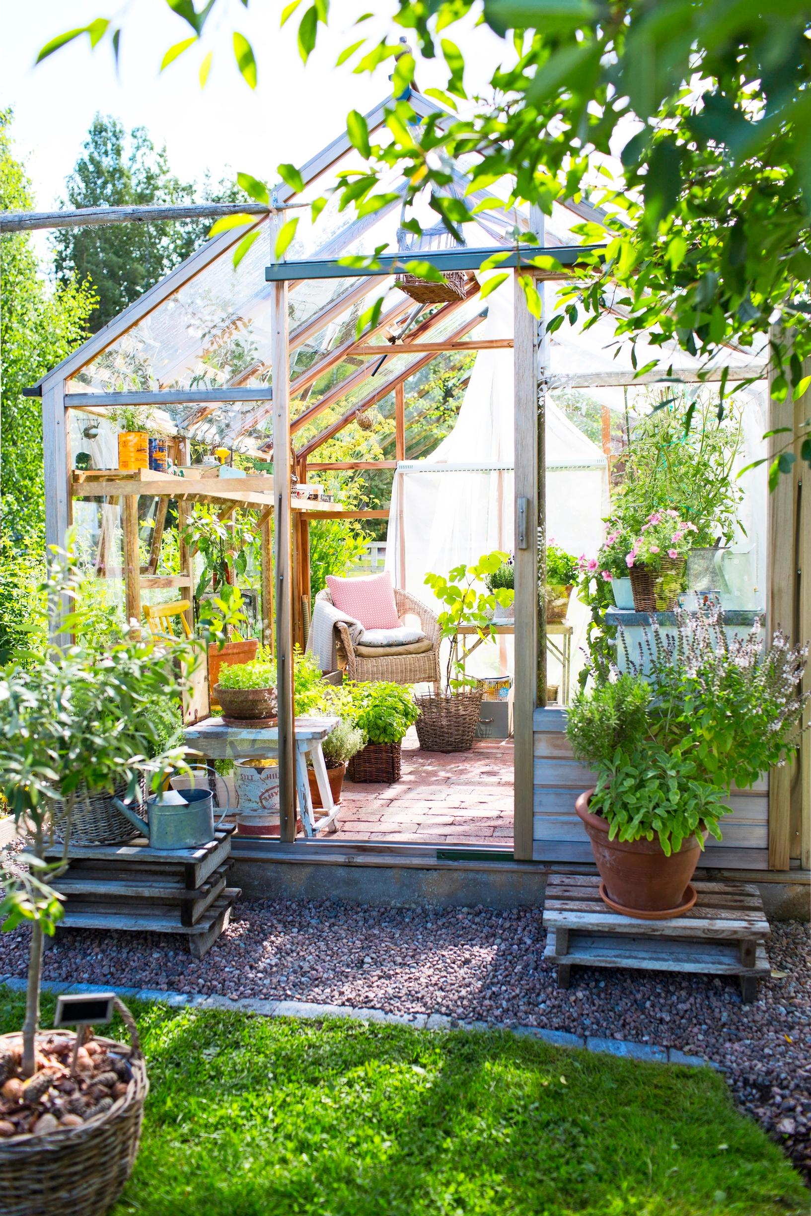 Kun kasvihuone sijaitsee terassialueen vieressä, se toimii myös suojaisana oleskelupaikkana.
