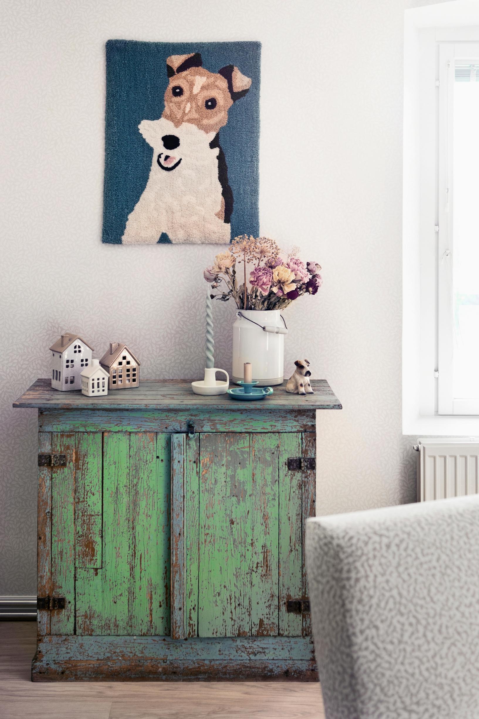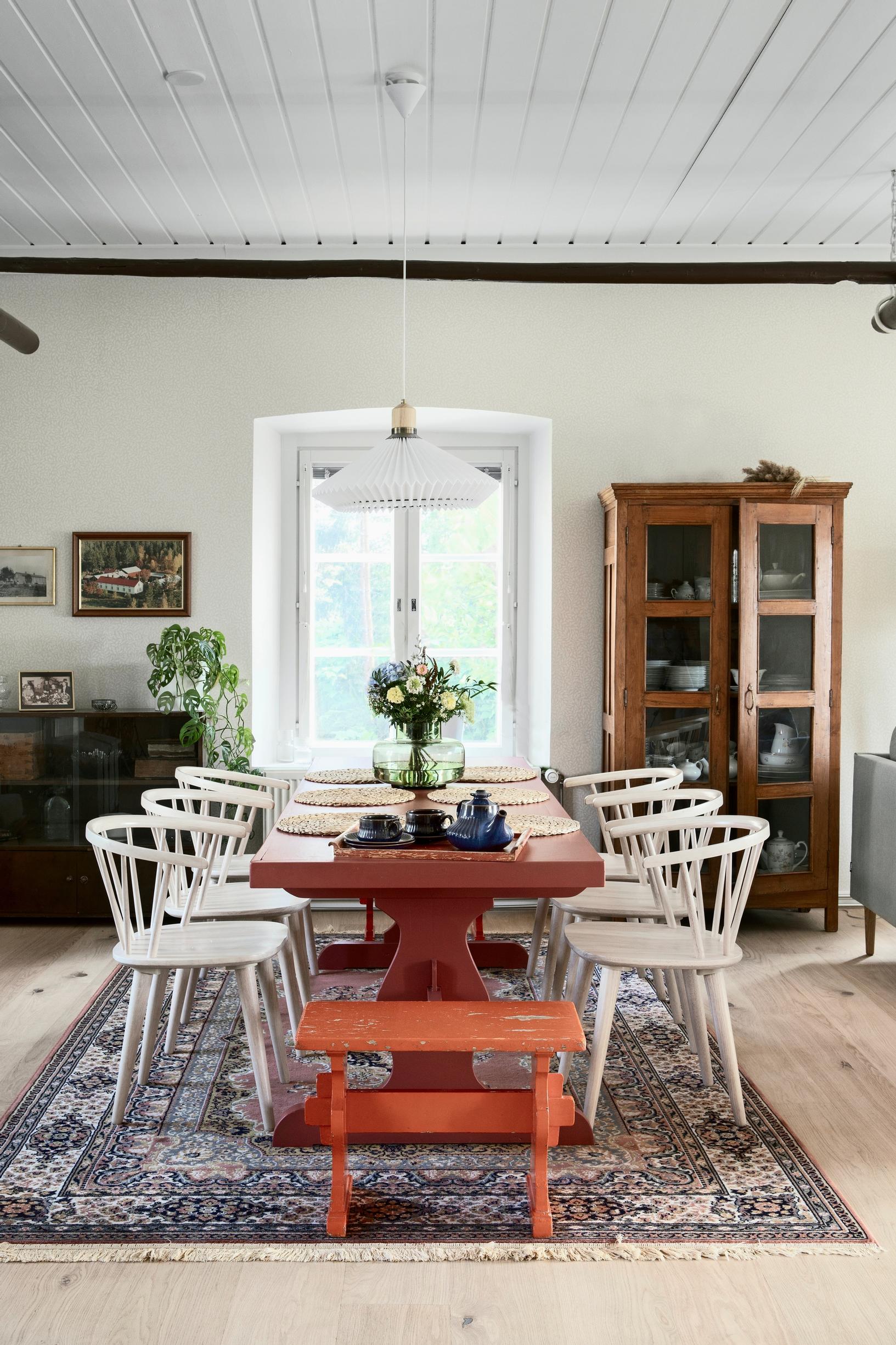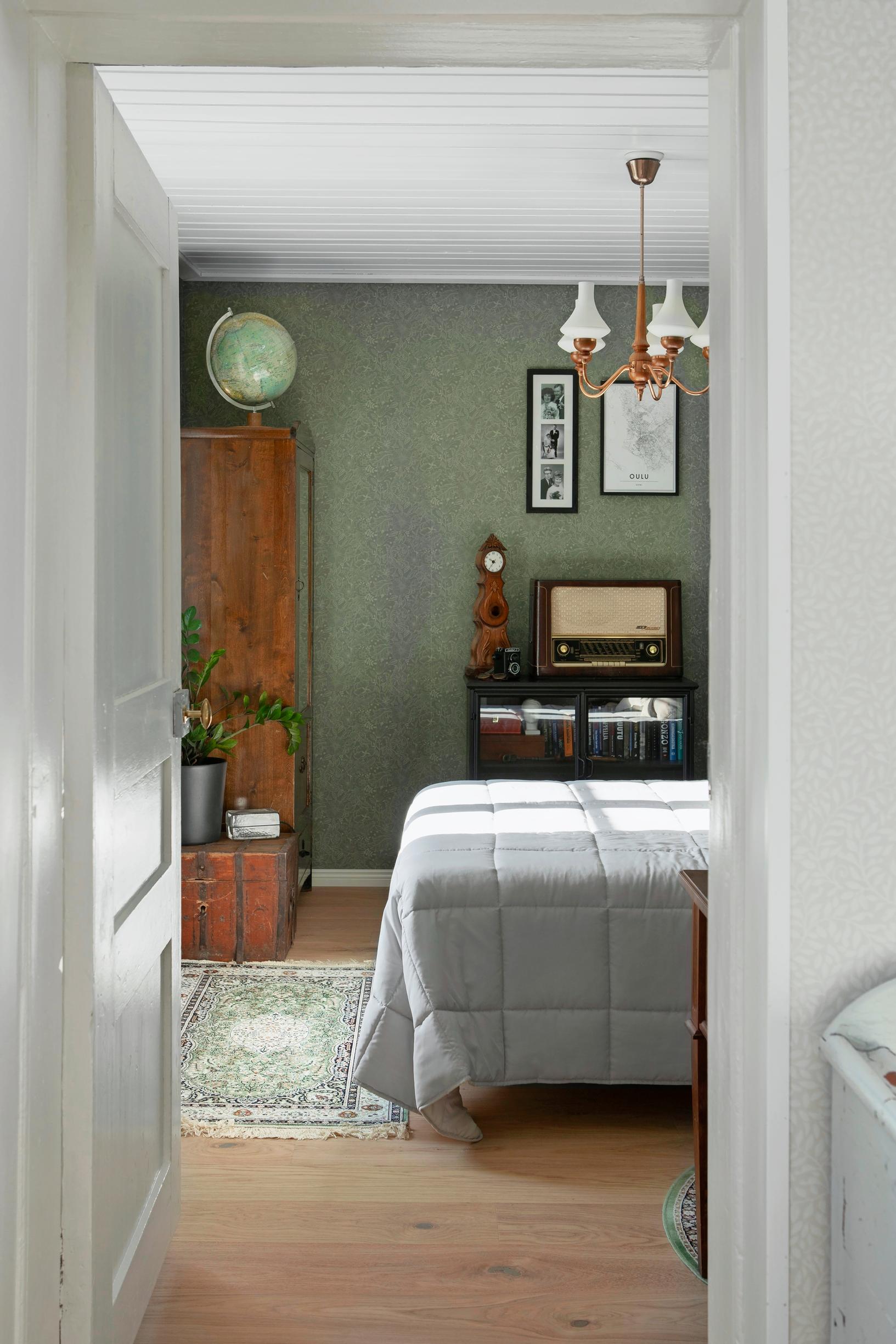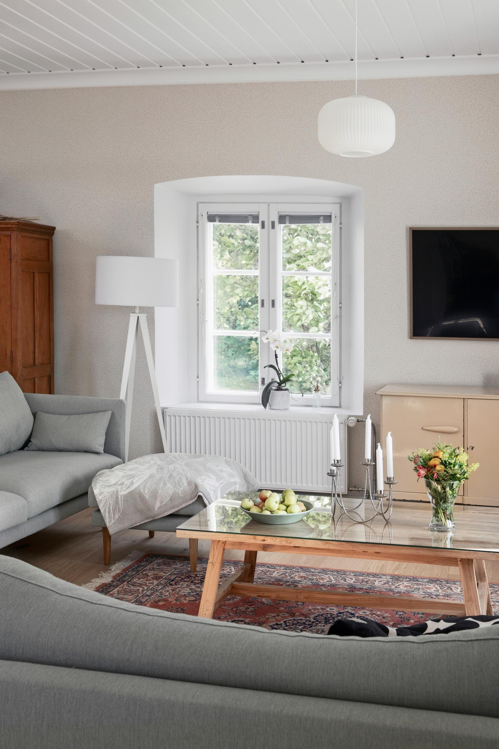 ”Mietimme remontissa että olisimme ottaneet tiiliseinän esille tuosta pirtin päätyseinästä. Lopulta päätimme jättää sen ennalleen”, Tiia kertoo.