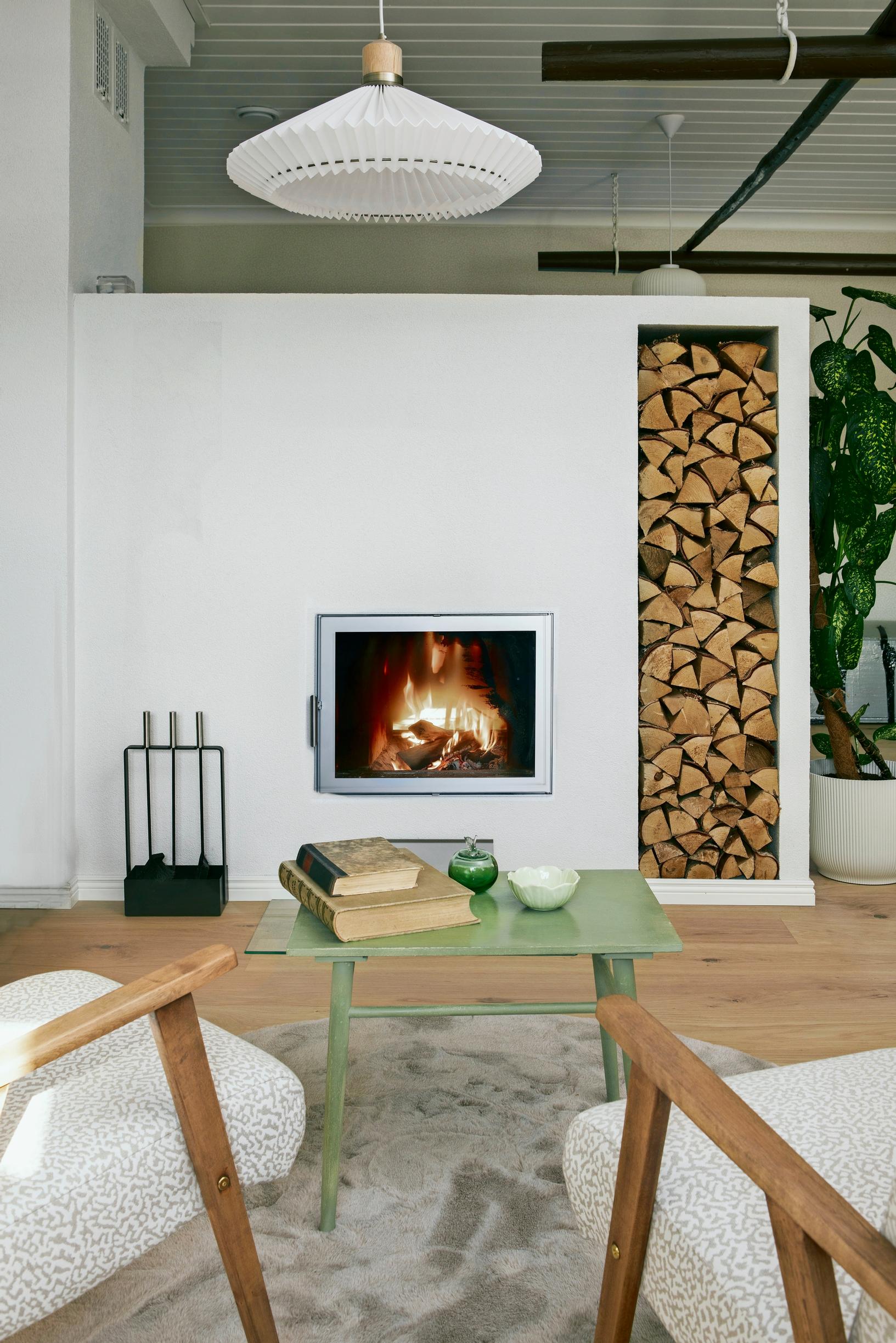 Lopputulos on kuitenkin kaiken vaivan arvoinen. Nyt säiliön ja uunin paikalla on kaksi uudelleen verhoiltua 1960-luvun nojatuolia. Oleskeluryhmästä voi fiilistellä lasiluukkujen takana hehkuvaa takkatulta.