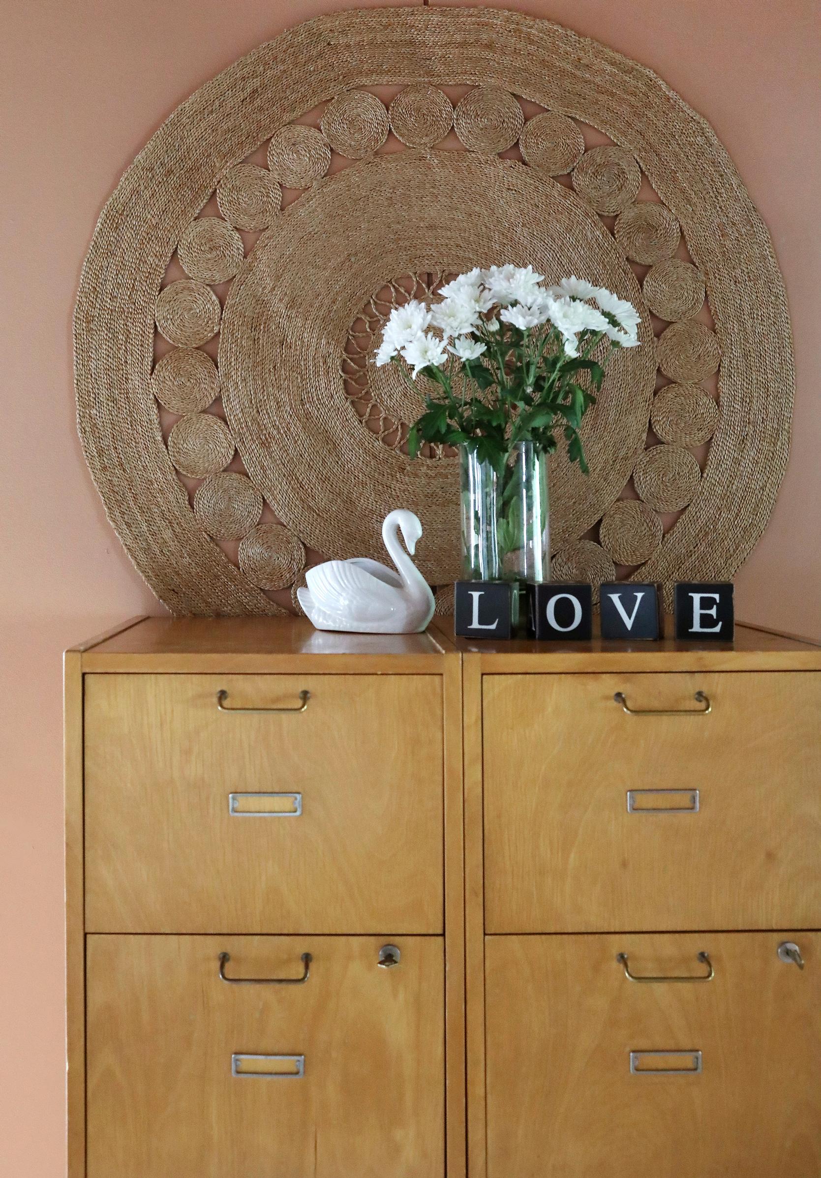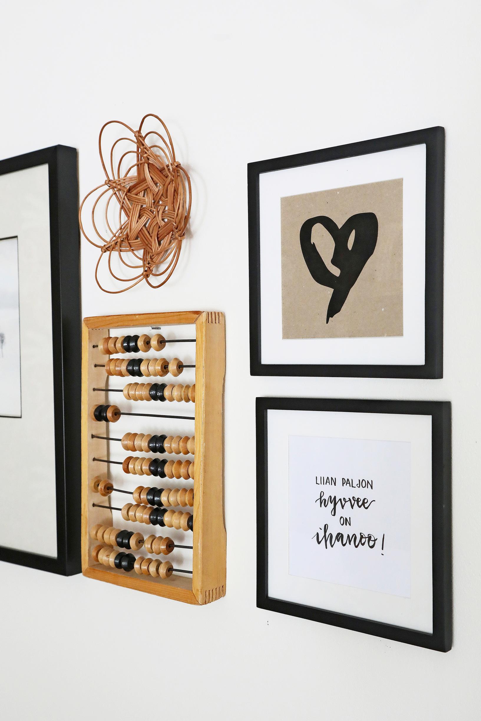 Riikka harrastaa seinäasetelmia. Olohuoneessa toisilleen pitävät seuraa vanha venäläinen helmitaulu, kirppikseltä löytynyt taidetaulu, kauniit korit ja oma tekstaustaide. ”Tärkeää on koota yhteen esineitä, joilla on tunnearvoa, jotka miellyttävät esteettistä silmää tai joista tulee hyvä mieli.”