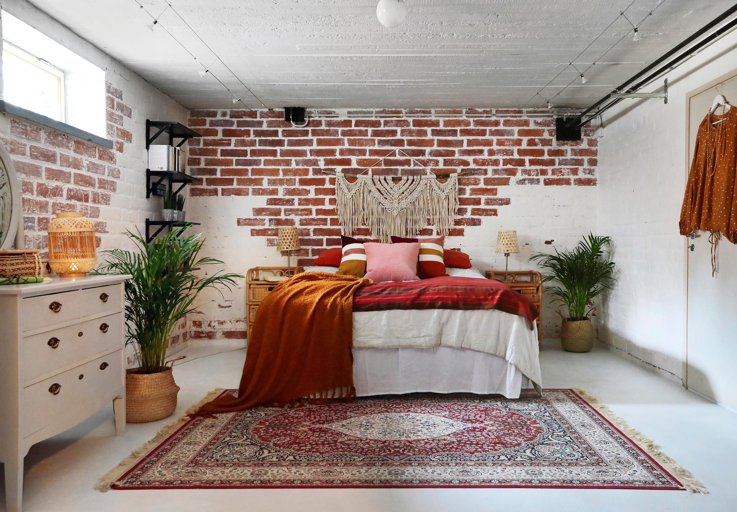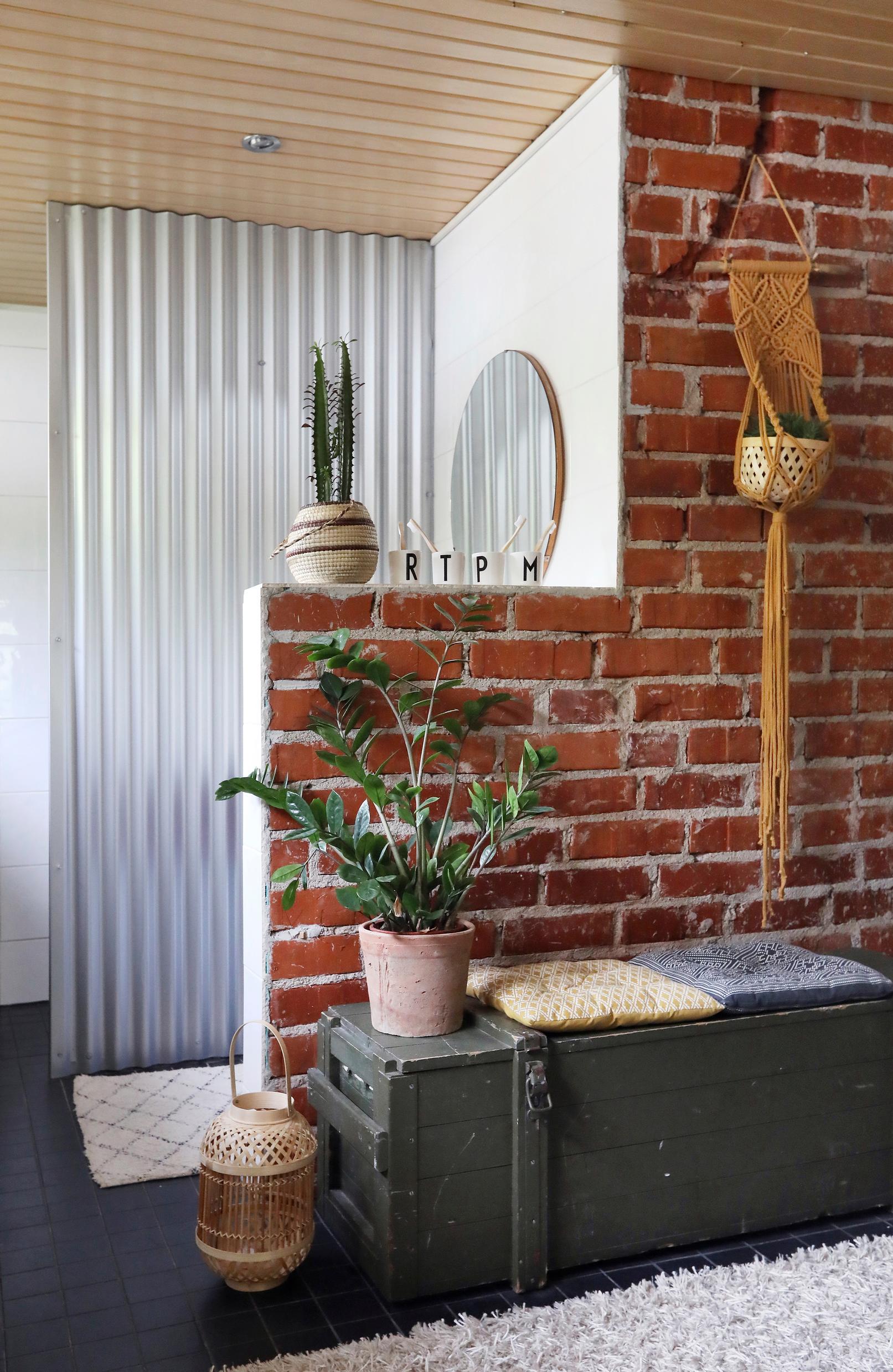 Lasketaanko tiilenpäitä? ”Koska makuuhuoneemme sijaitsee kellarissa, siellä oli jo alun perin kaksi tiiliseinää, joista punatiiltä oli kaivettu osittain esiin. Me teimme korjausmaalausta ja hioimme hiukan lisää. Rouhea ja ilmeikäs seinä antoi suunnan koko sisustukselle.”
