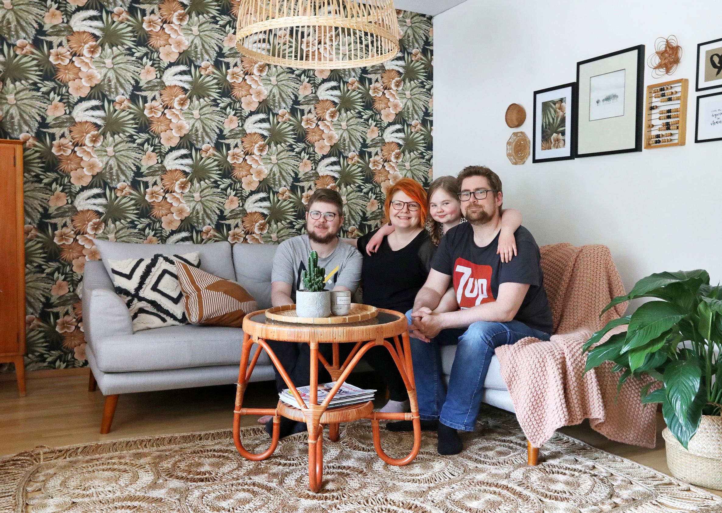 Kun Riikka ja Tuukka saapuivat taloesittelyyn, jo ovella he tunsivat tulleensa kotiin. Vanhemmille pitävät seuraa sohvalla lapset Pyry ja Milma. 1960-luvun talo on vastaanottanut Riikan boheemin sisustustyylin auliisti. Kodissa on ripaus Afrikkaa ja itämaisuutta, ja värimaailma on luonnonläheinen ja lämmin. Ellokselta löytynyt haaveiden Leon-tapetti sopii taloon kuin nakutettu. Lumikenkä-pöytä löytyi kirppikseltä edullisesti.