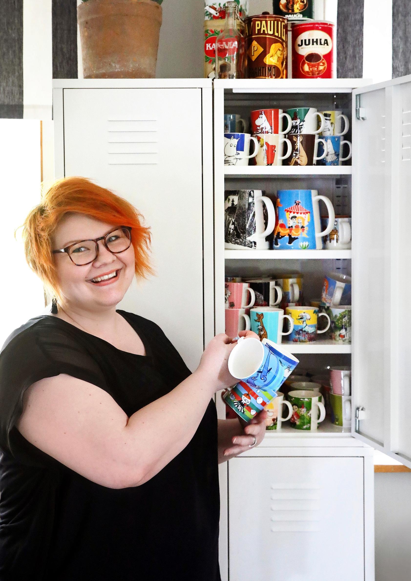 Riikka on kerännyt muumimukeja vuodesta 1999 lähtien. Hän vitsailee, että kokoelma on hänen perintönsä lapsille, mutta mukit ovat silti jokapäiväisessä käytössä. Ikean peltikaapit ovat persoonallinen säilytysratkaisu keittiöön. Ne ostettiin talon edellisiltä omistajilta.