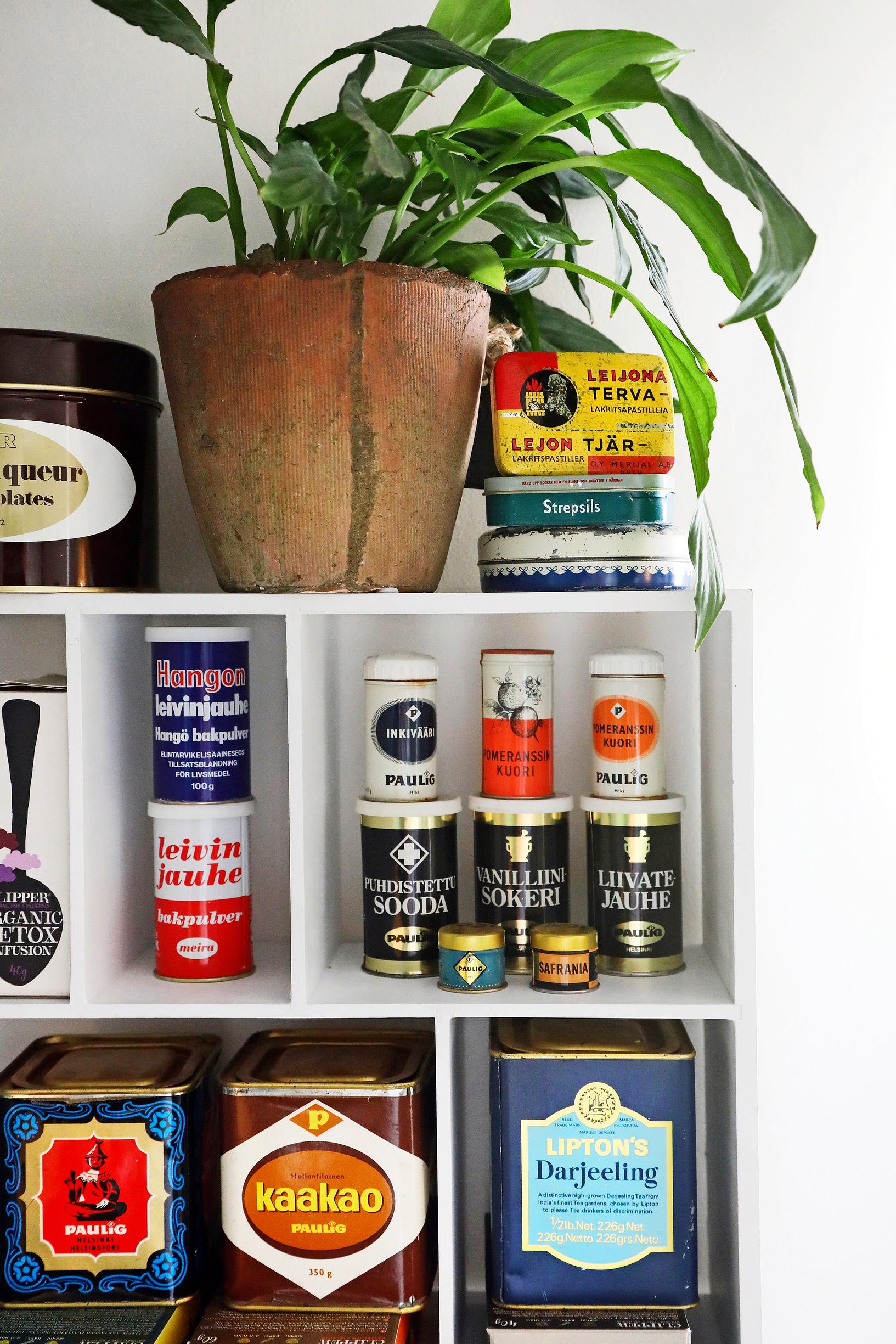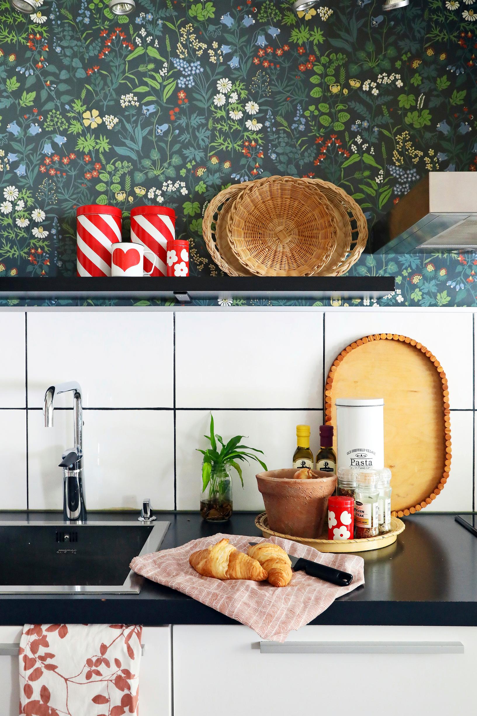 Keittiö koki kasvojenkohotuksen Boråstapeterin ihanan Jubileum-tapetin ansiosta. Tapettia oli sattumalta jäänyt yli ystävän remontista juuri sopiva määrä. Alaosassa olivat laatat jo valmiina. Punaiset Marimint-purkit ovat pirteä väriläiskä. Riikka keräilee vanhoja, nättejä peltipurkkeja kirppareilta.