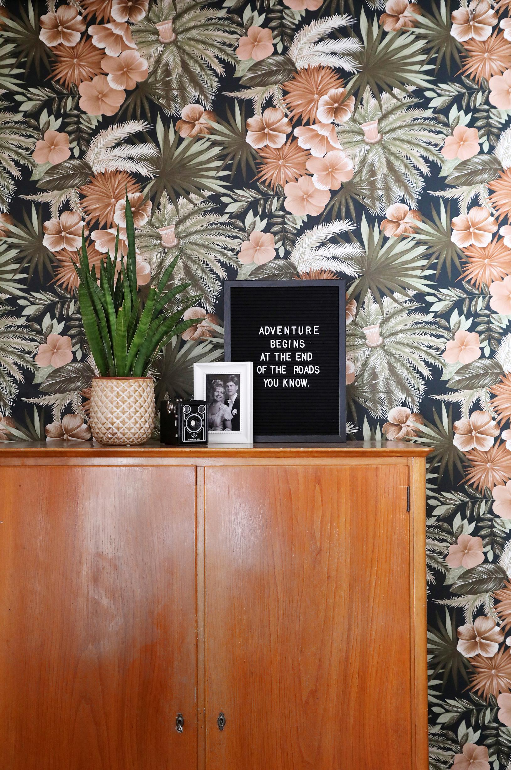 Silmäniloa tiskarille: ”Tiskipöydän päälle emme laittaneet yläkaappeja vaan tapetoimme seinän näyttävällä kuosilla. Alareunaan jätimme alkuperäiset laatat suojaamaan roiskeilta. Laattojen yläpuolelle tuli hylly näteille esineille."