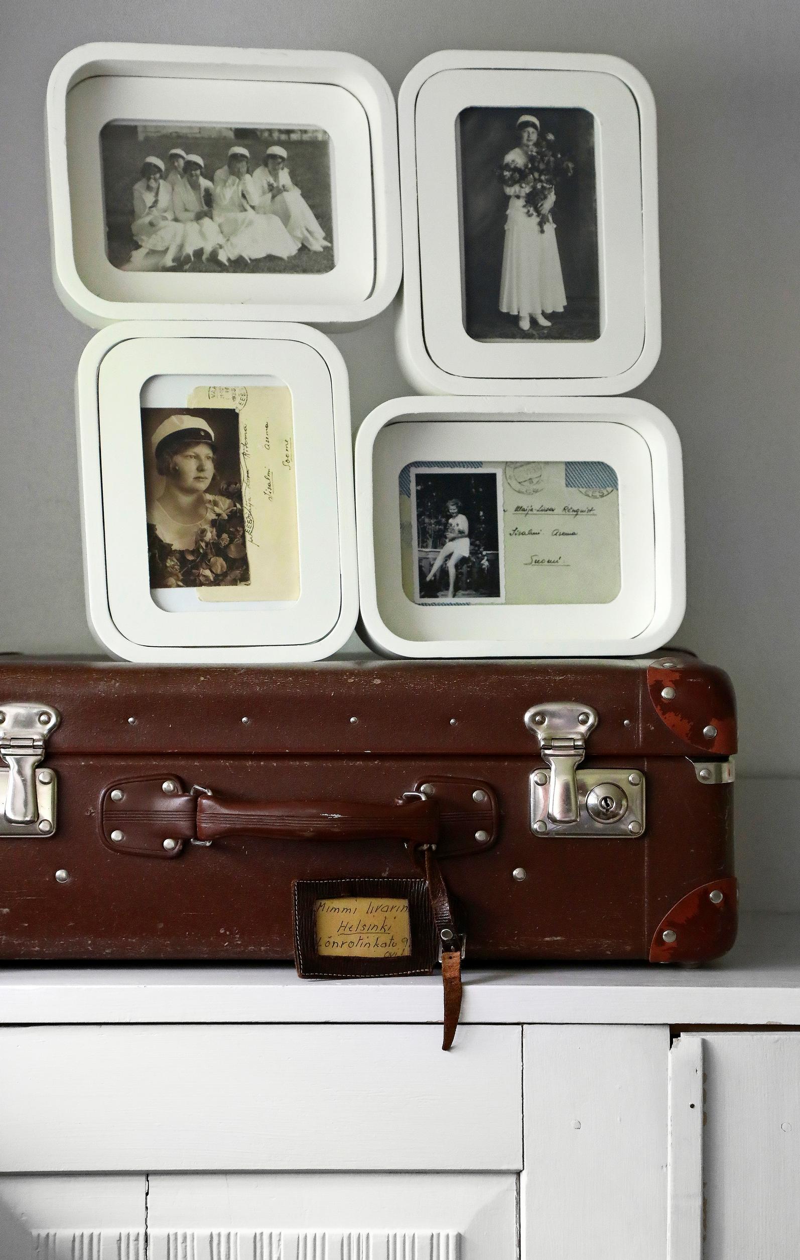 Kuvissa esiintyy Riikan Maija-mummi nuoruutensa päivinä. Riikka on kehystänyt kuvat nätiksi asetelmaksi. Matkalaukku on aikoinaan reissannut anopin isotädin mukana maailmalla.