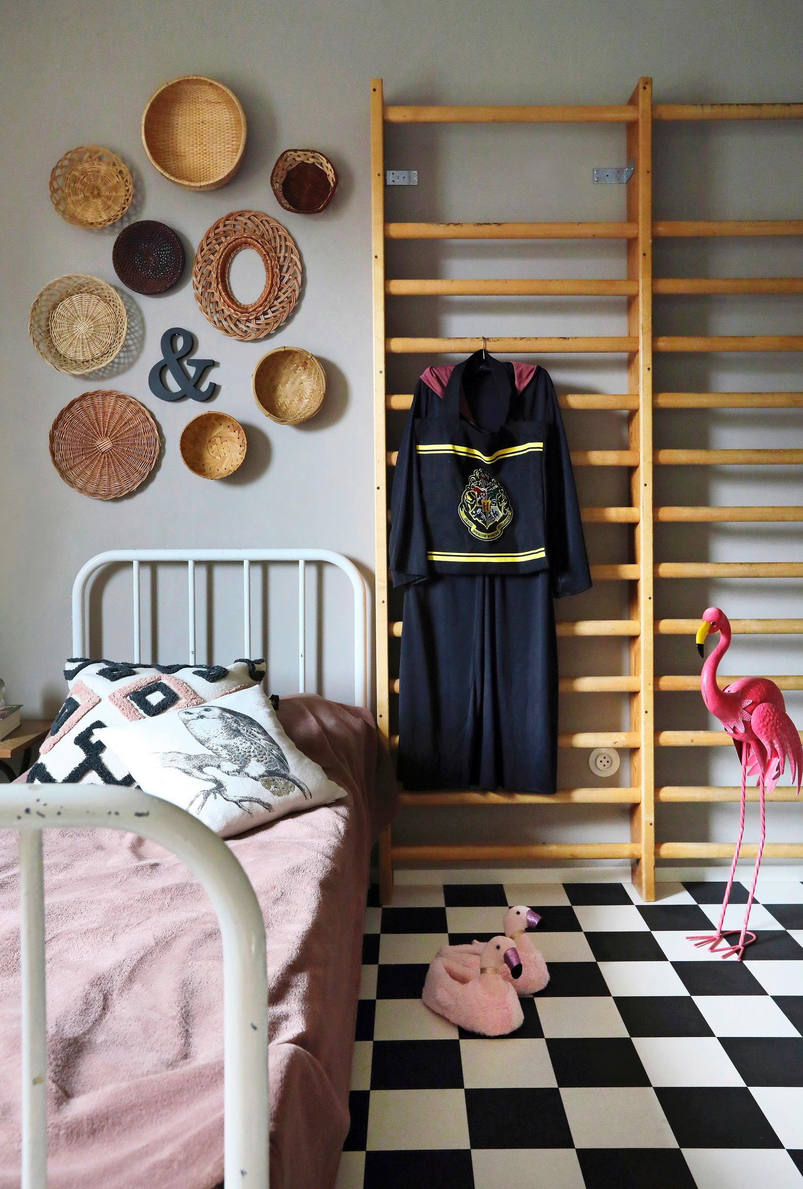 Milma ja äiti ihastuivat alun alkaen Milman huoneen ruutulattiaan ja puolapuihin. Puolapuissa roikkuu Harry Potterin rohkelikkoasu. Vanha sairaalasänky on saatu ystävältä. Flamingo kotiutui tänne Lidlistä. Tytär on perinyt äidiltään ihastuksen koreihin.