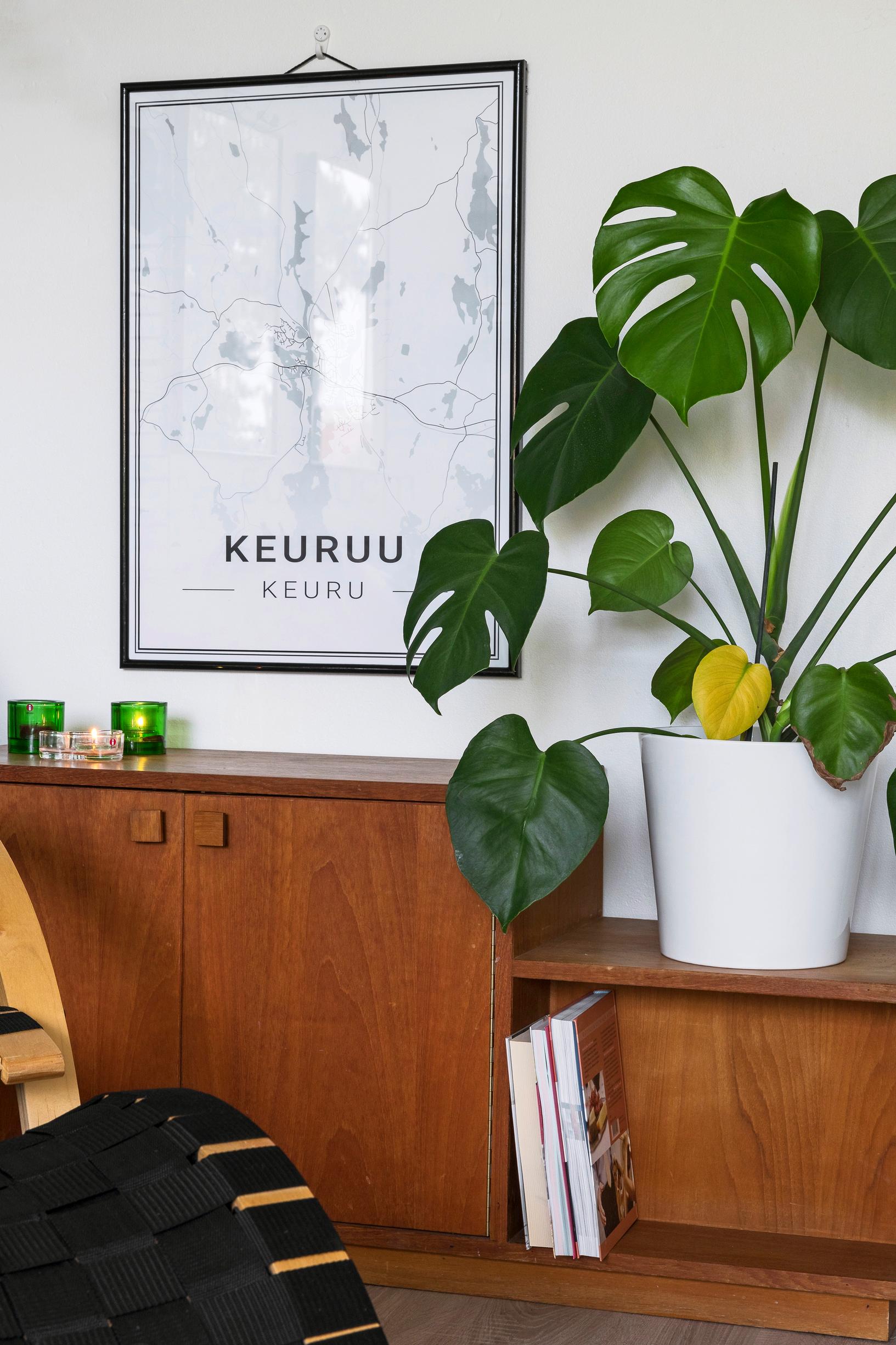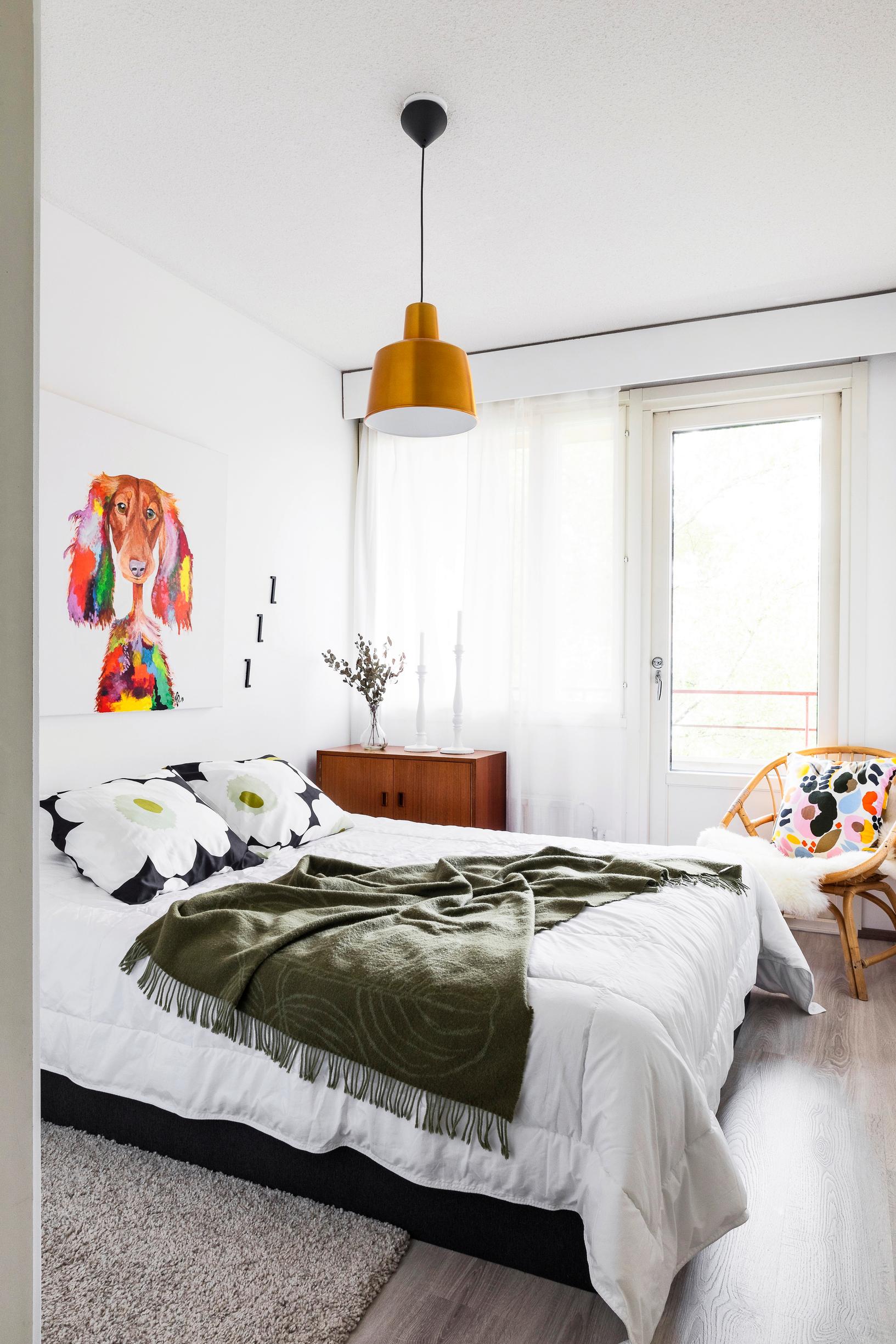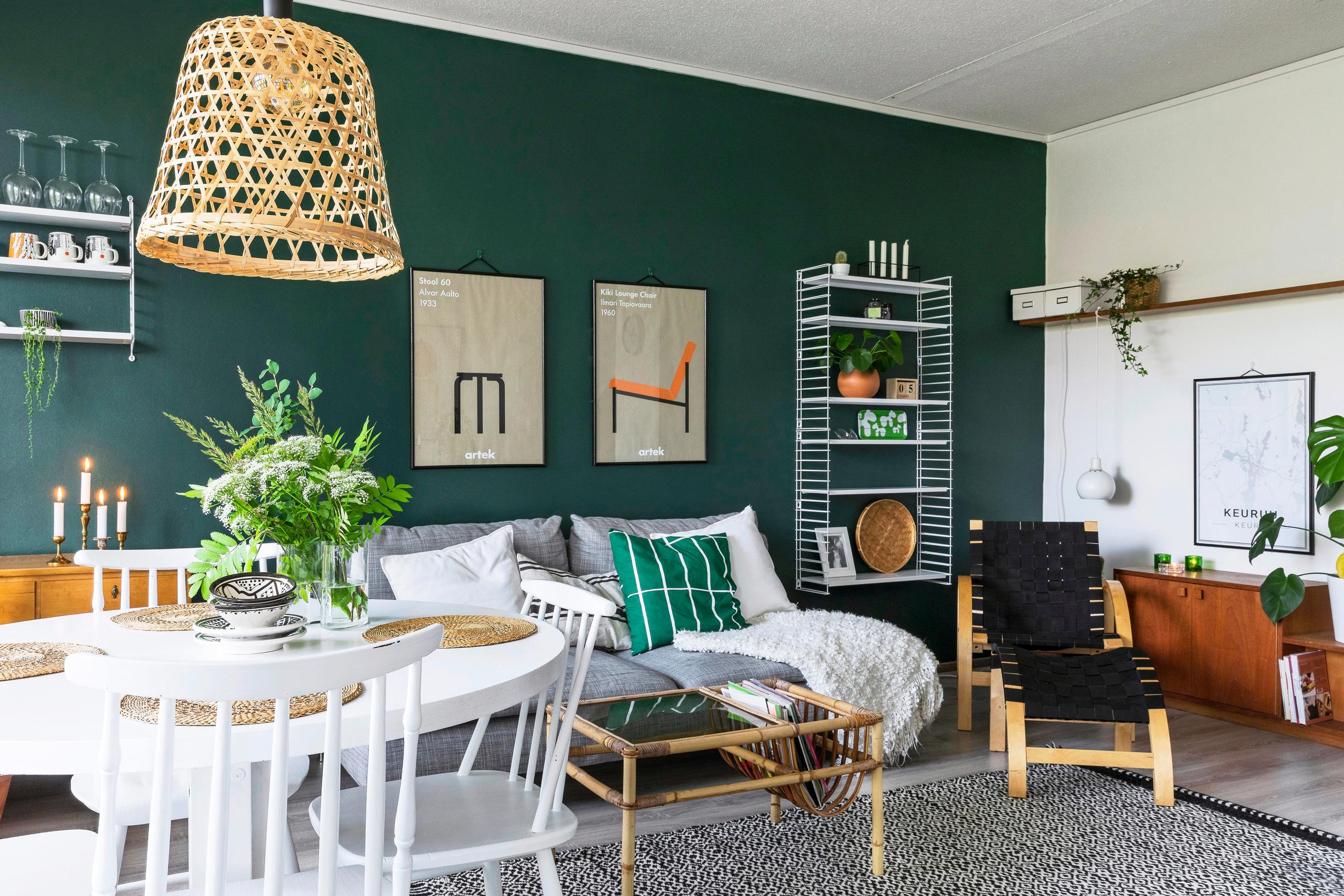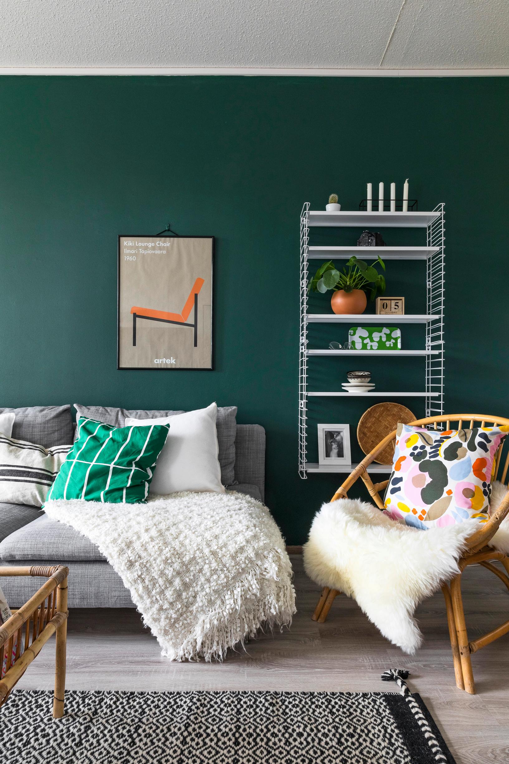 Kun Heidi näki vuokrakaksionsa ensimmäisen kerran, lattiaa peitti vihreä muovimatto ja seinät olivat keltaiset. Remontin myötä tunkkaisesta asunnosta kuoriutui raikas ja viihtyisä. Vihreä väri ei jäänyt kodissa kokonaan historiaan, sillä olohuoneessa sisustusta korostaa hienosti syvänvihreä seinä.