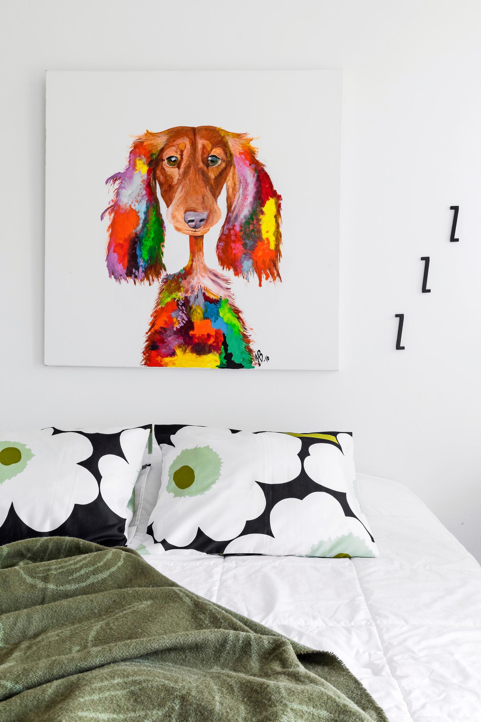 Heidi Blomqvist on maalannut Väinö-koirastaan värikkään potretin makuuhuoneen seinälle. Naama näyttää aidolta, muuten Heidi on käyttänyt taiteilijan vapauksia. Hän on niin innostunut maalaamisesta, että nykyään tutut ja myös tuntemattomat tilaavat häneltä muotokuvia lemmikeistään.