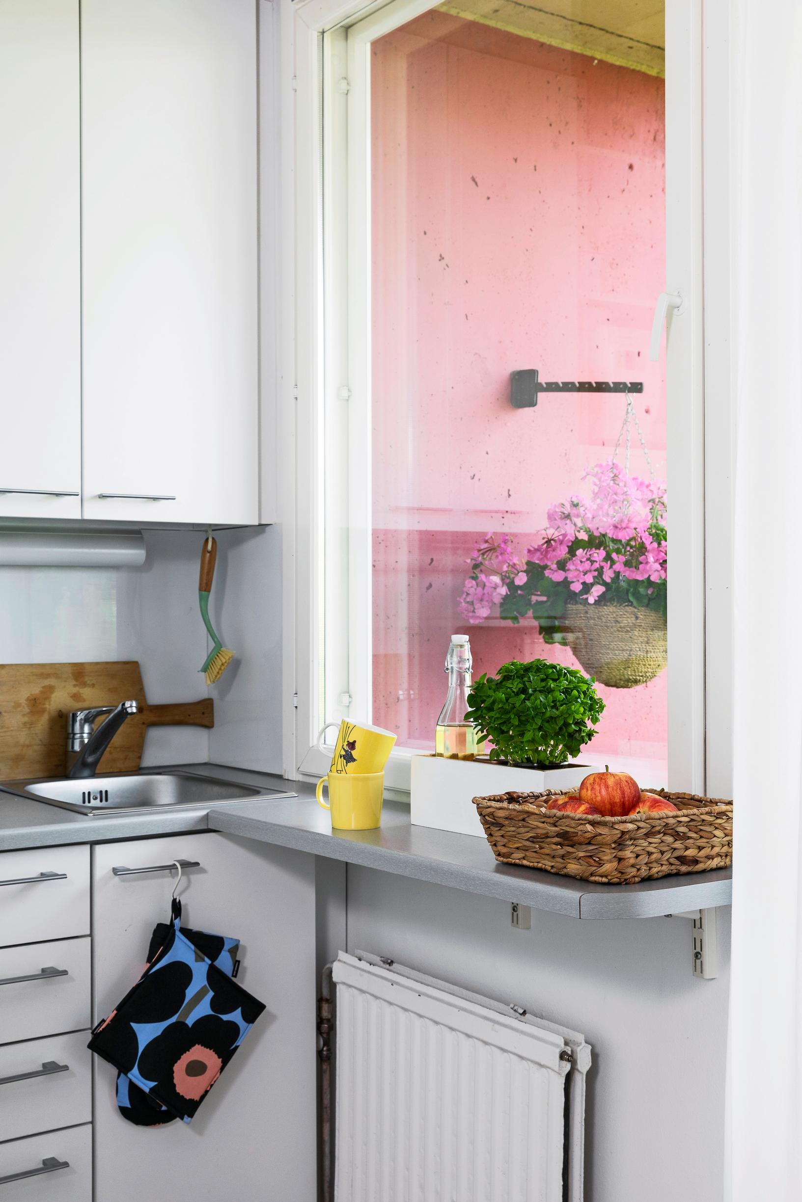 Keittiön uusivat ammattilaiset, minä maalasin seinät ja kaapit. Laminaattilattian asensimme yhdessä isäni kanssa. Alkuperäisessä kunnossa on enää vessa.