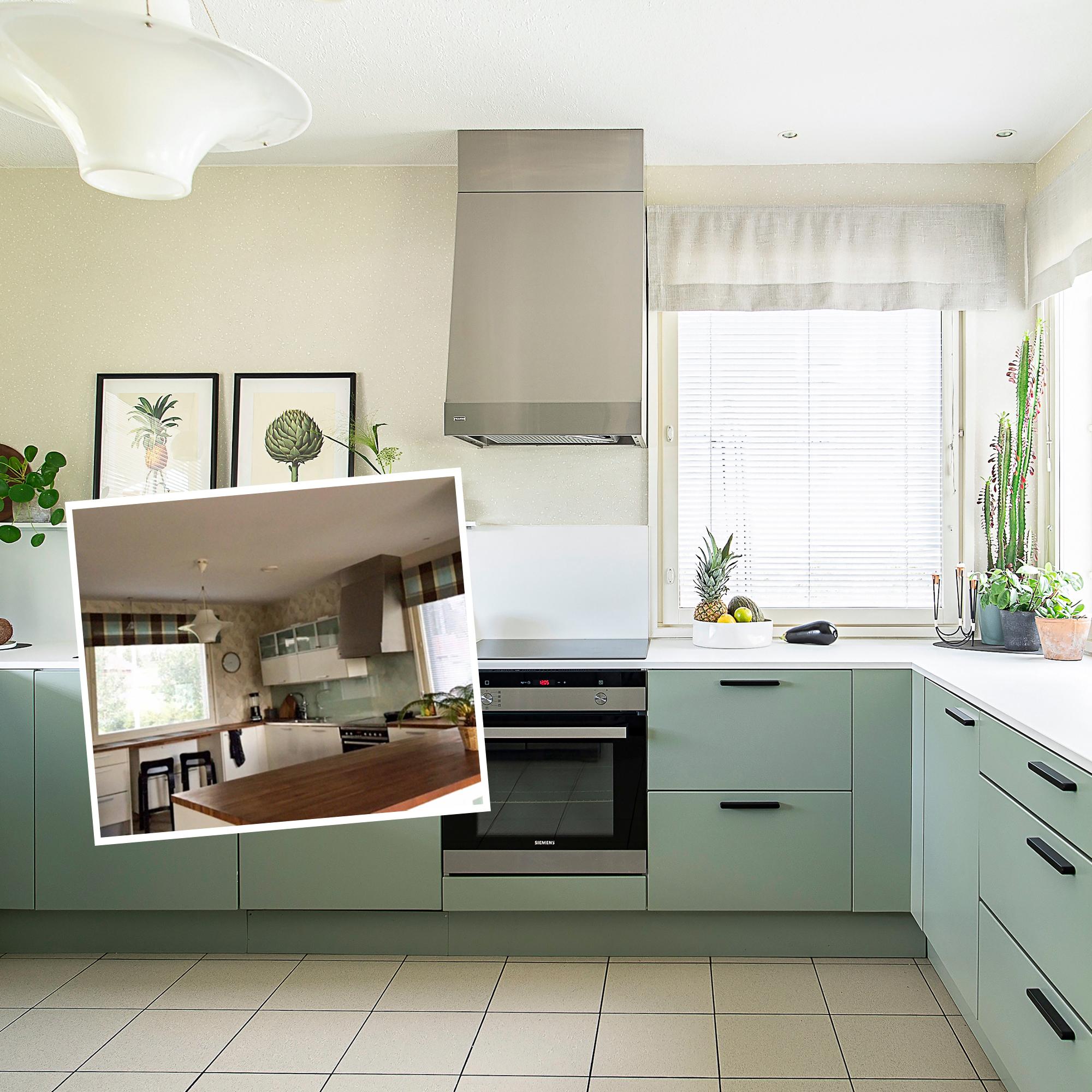 20 vuotta vanha keittiö sai jatkoaikaa edullisella pintaremontilla – raikas muutos toteutettiin maalaamalla ja vanhaa kunnostamalla