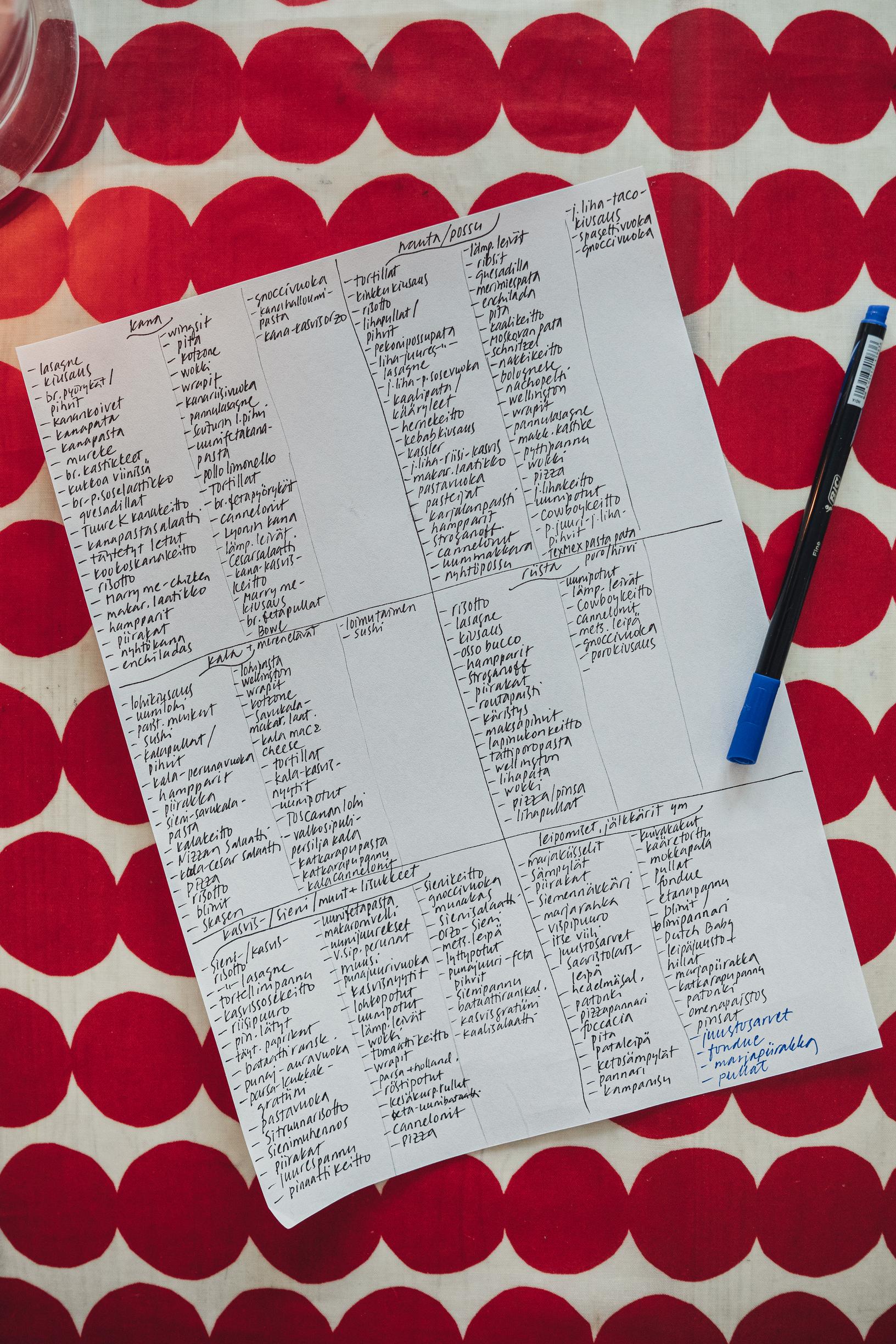 Listoistani on tullut vähän vitsi kaveripiirissä. Lista on aina jääkaapin ovessa, ja sen perusteella valitsen 3–6 seuraavaa ateriaa. Samalla kun päätän viikon ruoat, katson mitä kaapeista löytyy ja mitä pitäisi syödä pois pakastimesta.