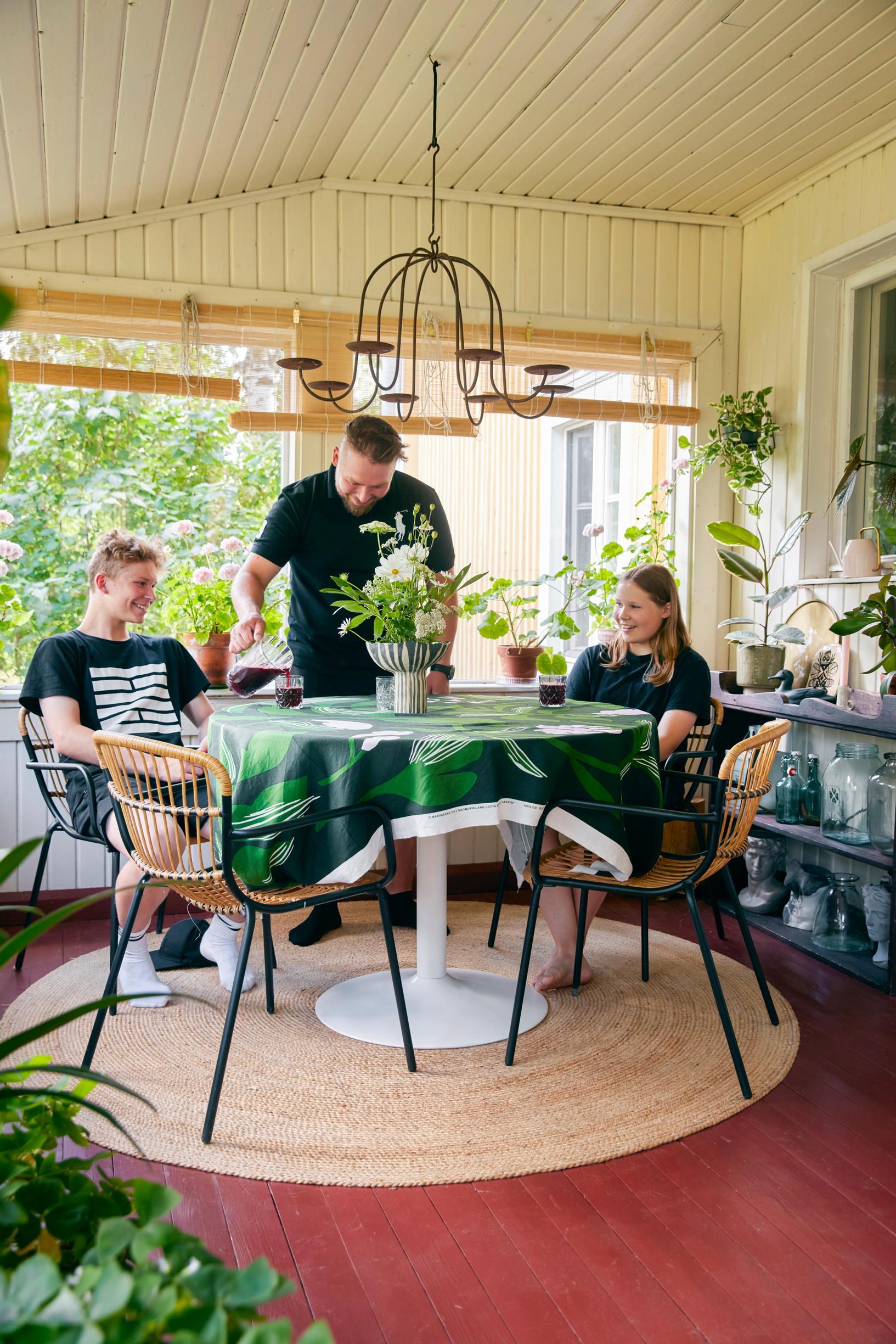 Tanjan ja Saulin kodin alakerta on 30 metriä pitkä. Video lähtee liikkeelle olohuoneesta, jonka ruskeat wieniläistuolit ovat Tanjan mummon perintöä, muut kirpputorilta. Shakkilauta on ahkerassa käytössä, ja lapset tuulettavat, kun he voittavat vanhempansa. Ikkunasta näkee kuistille, perällä vanhempien makuuhuone. Videolla kuljetaan keittiön ja kodinhoitotilan läpi savutupaan.