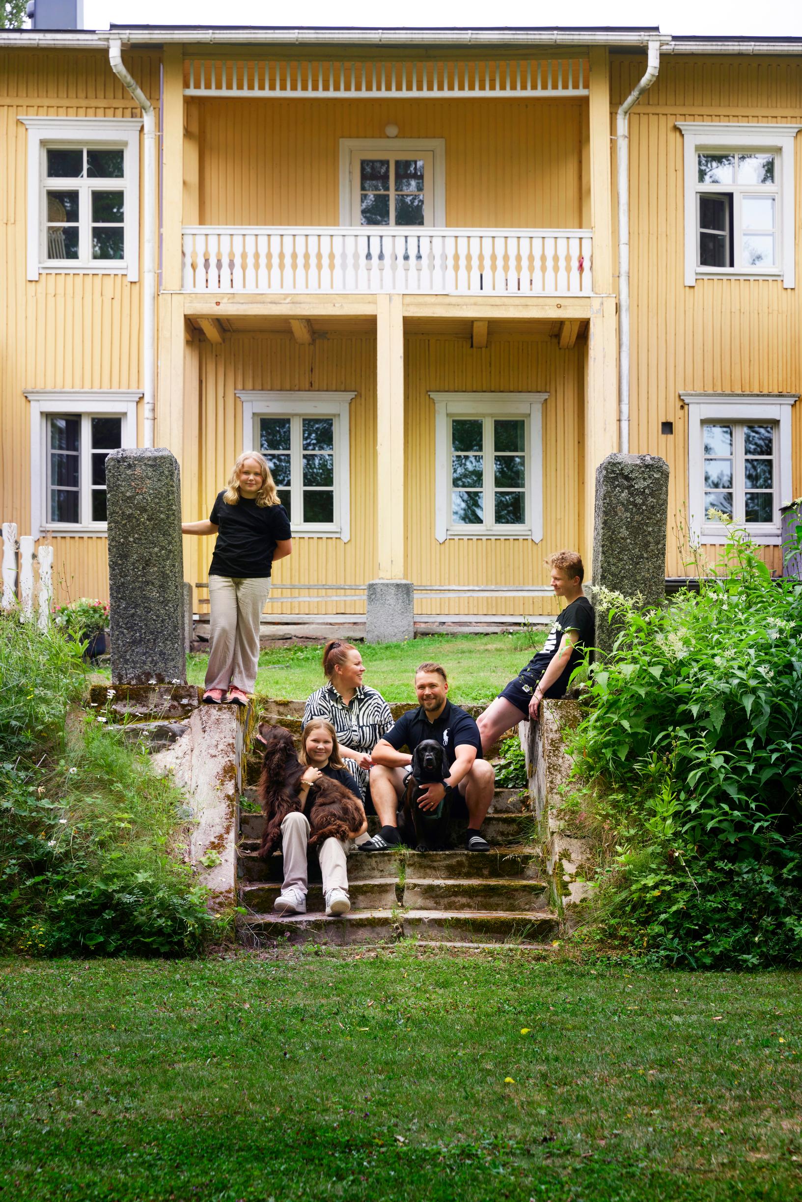 Täällä asuvat: Tanja Nisu, 40, Sauli, 37, Eemeli, 14, Emma, 13, ja Emilia, 11, Taavitsainen. Koirat Peppi ja Rene, kissat Kiki ja Laku.