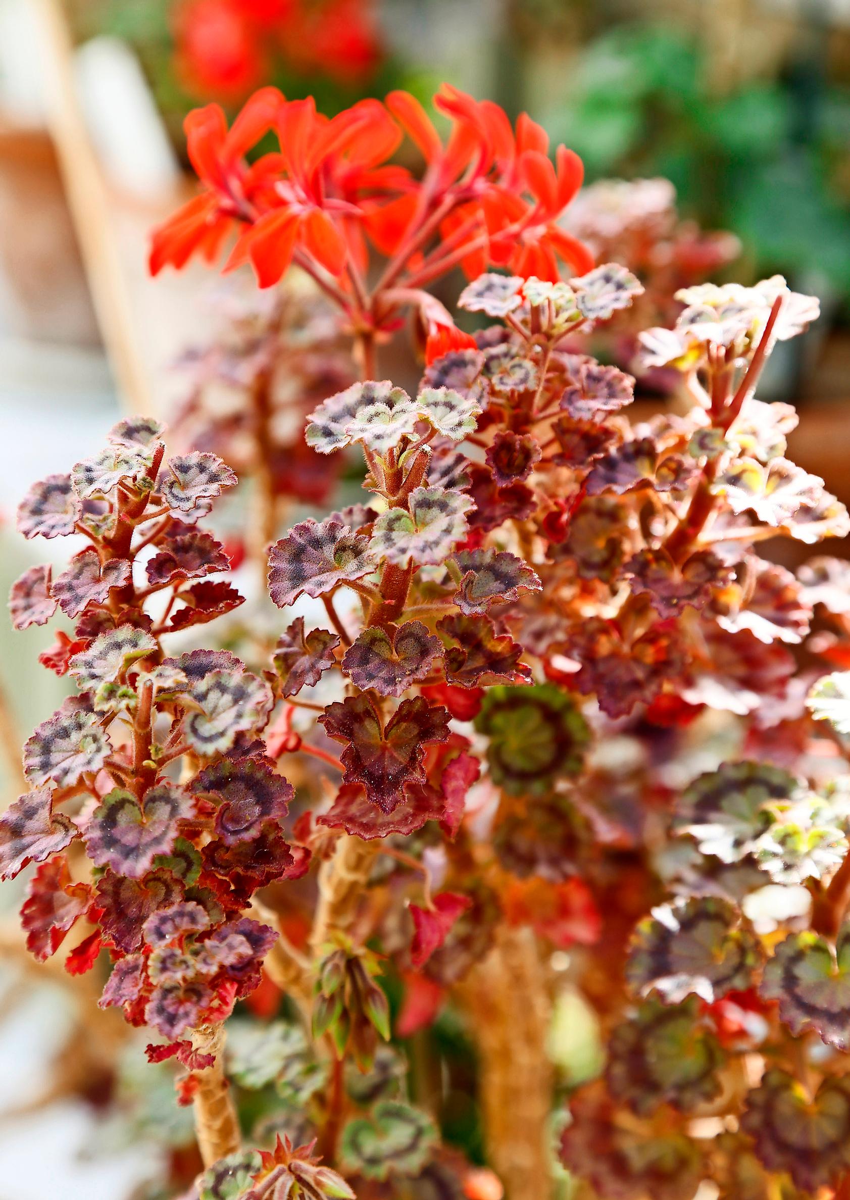 Uniikkipelargonin harmaanvihertävät lehdet täydentävät tummia kukkia.