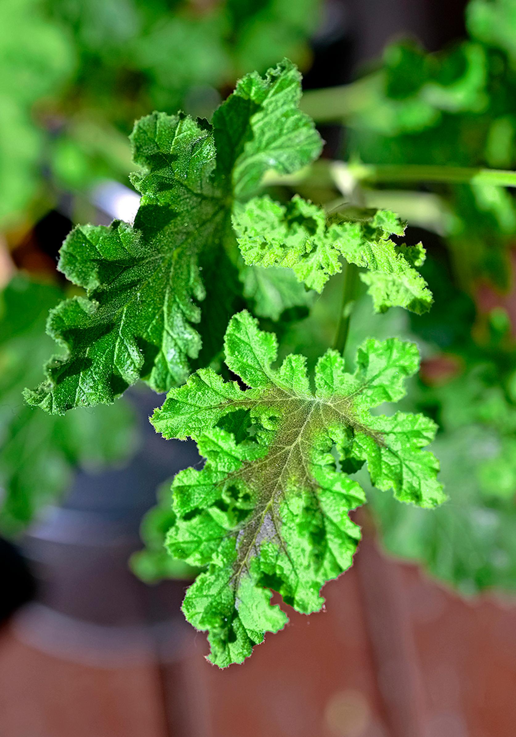 Havuntuoksuisen tuoksupelargonin lehtiä koristaa tumma kuvio. Taimi sai alkunsa kukkakaupasta ostetun pelargonin pistokkaasta.