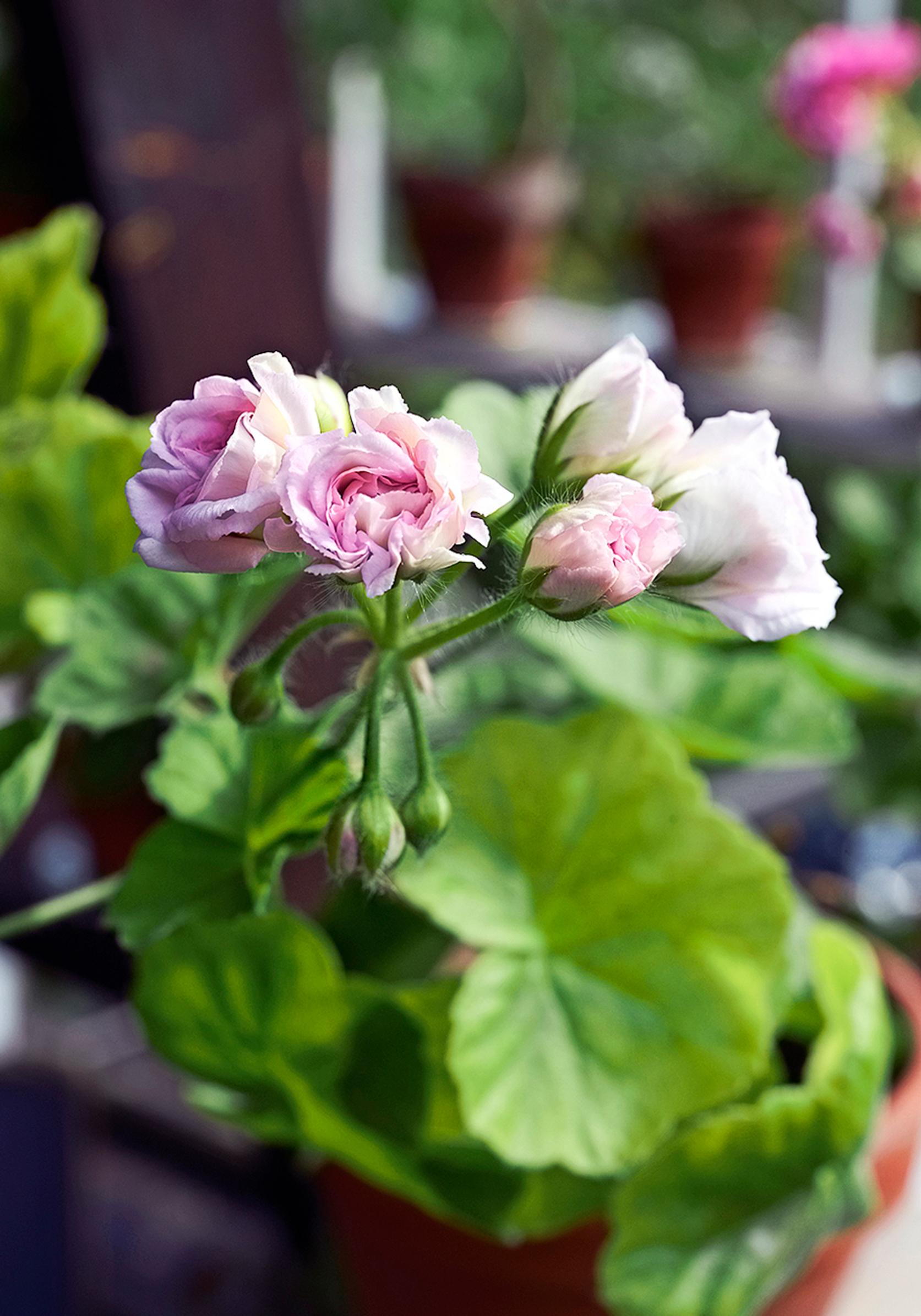 Ruusunnuppupelargoneissa on monia kestäviä ja helppohoitoisia lajikkeita.