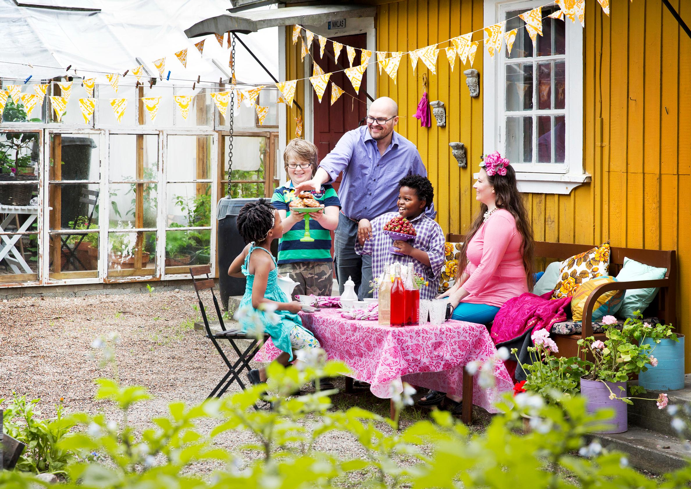 3 h + k! Ninetten perheen pihalla luetaan, pelataan, syödään ja rentoudutaan
