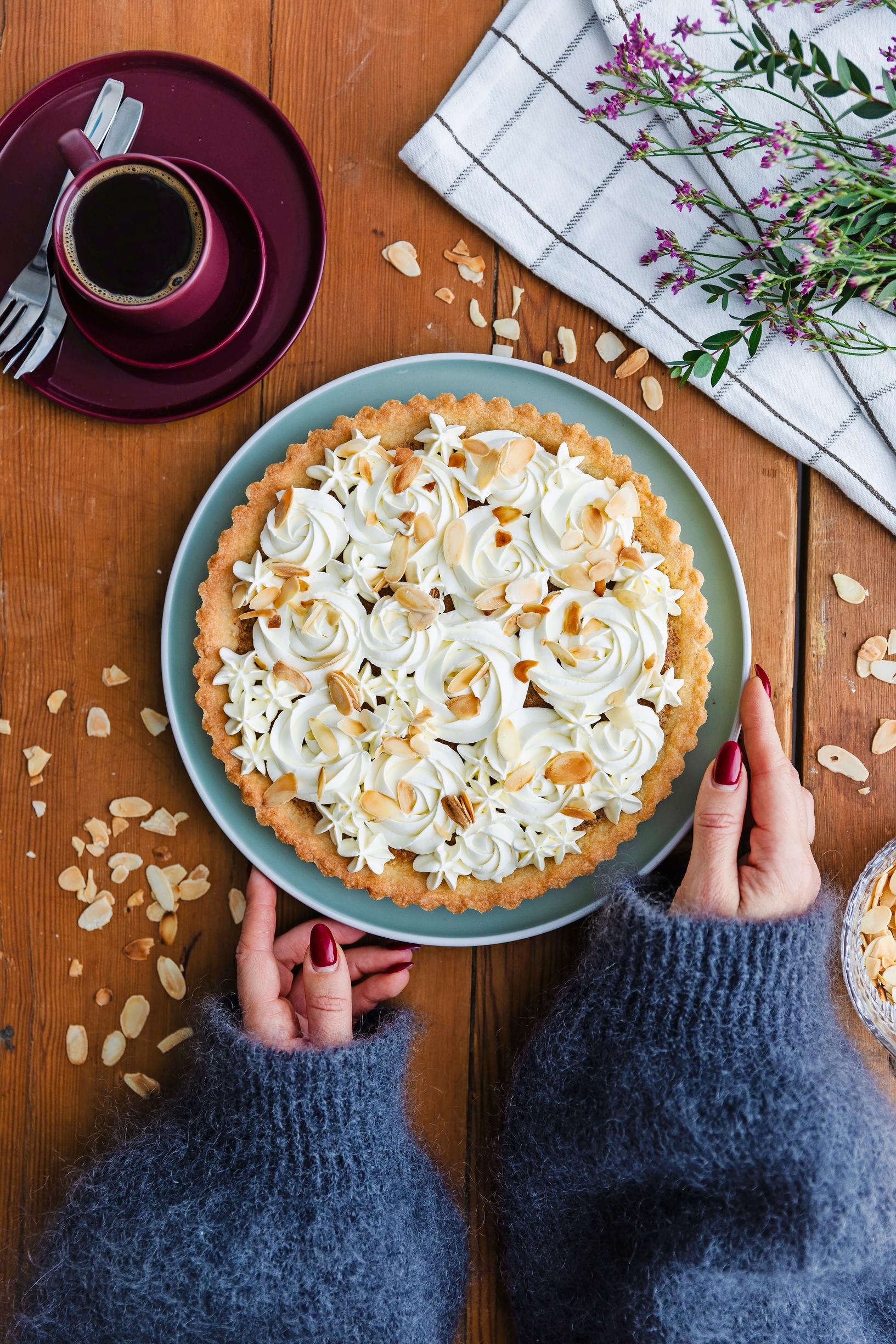 1. Laskiaispiirakka hurmaa paahdetulla mantelimassalla ja kermaruusukkeilla