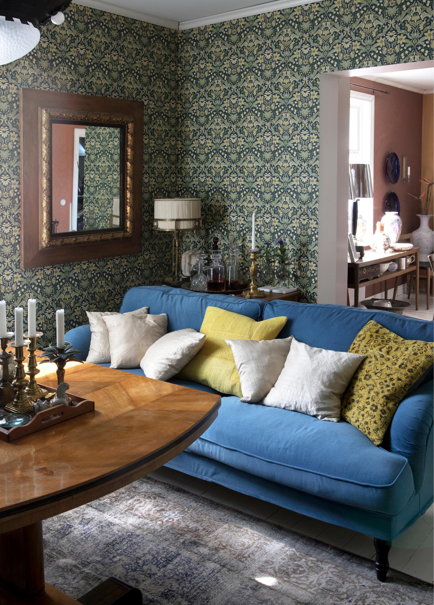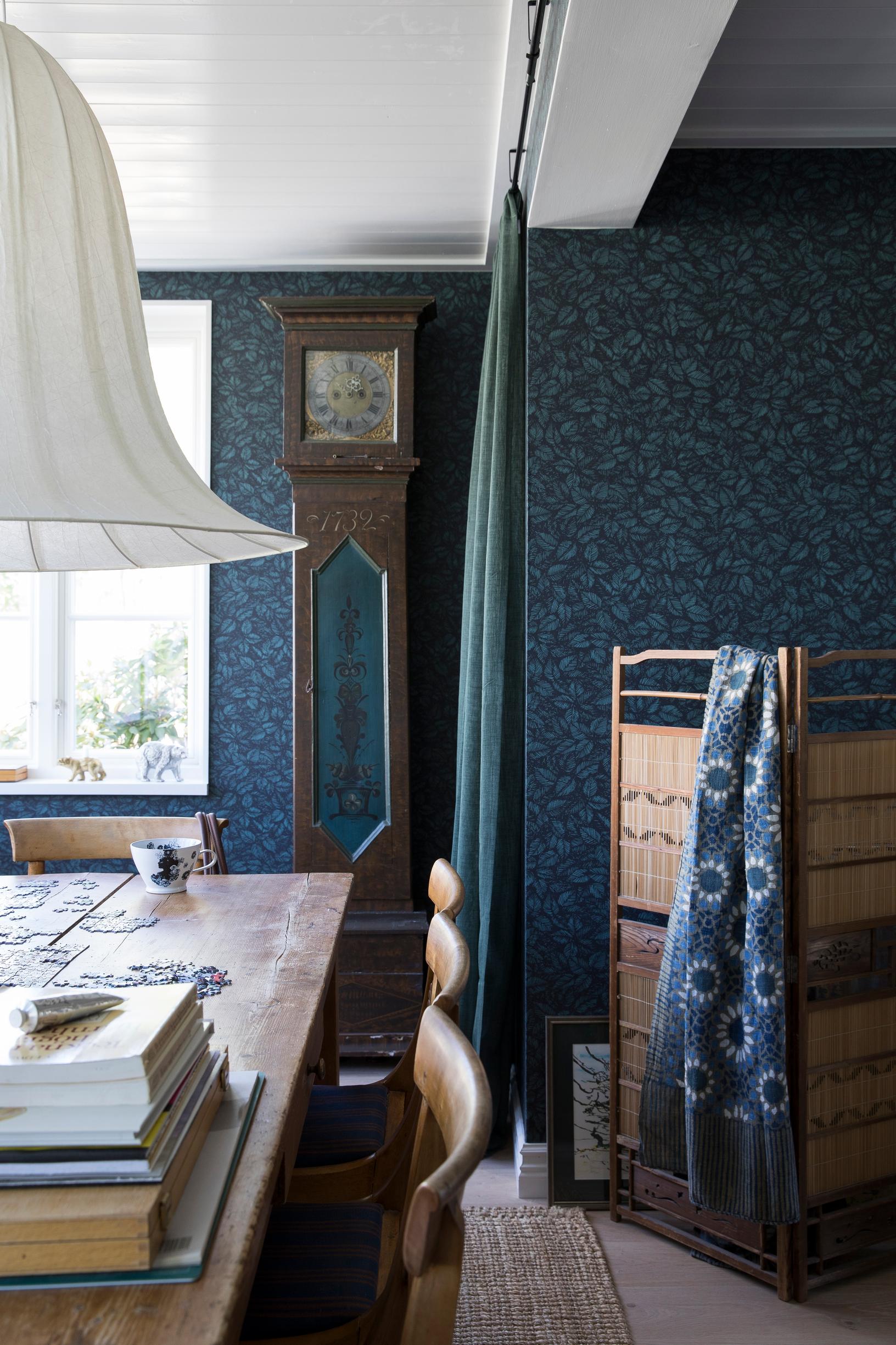 Ruotsalaisen omakotitalon työhuone on tapetoitu hurmaavalla vintagetapetilla, joka tuo huoneeseen ripauksen itämaista tyyliä, vaikka huone on kalustettu talonpoikaistyylisillä puukalusteilla. Sininen sopii hienosti yhteen vaaleiden ja tummien puukalusteiden kanssa.