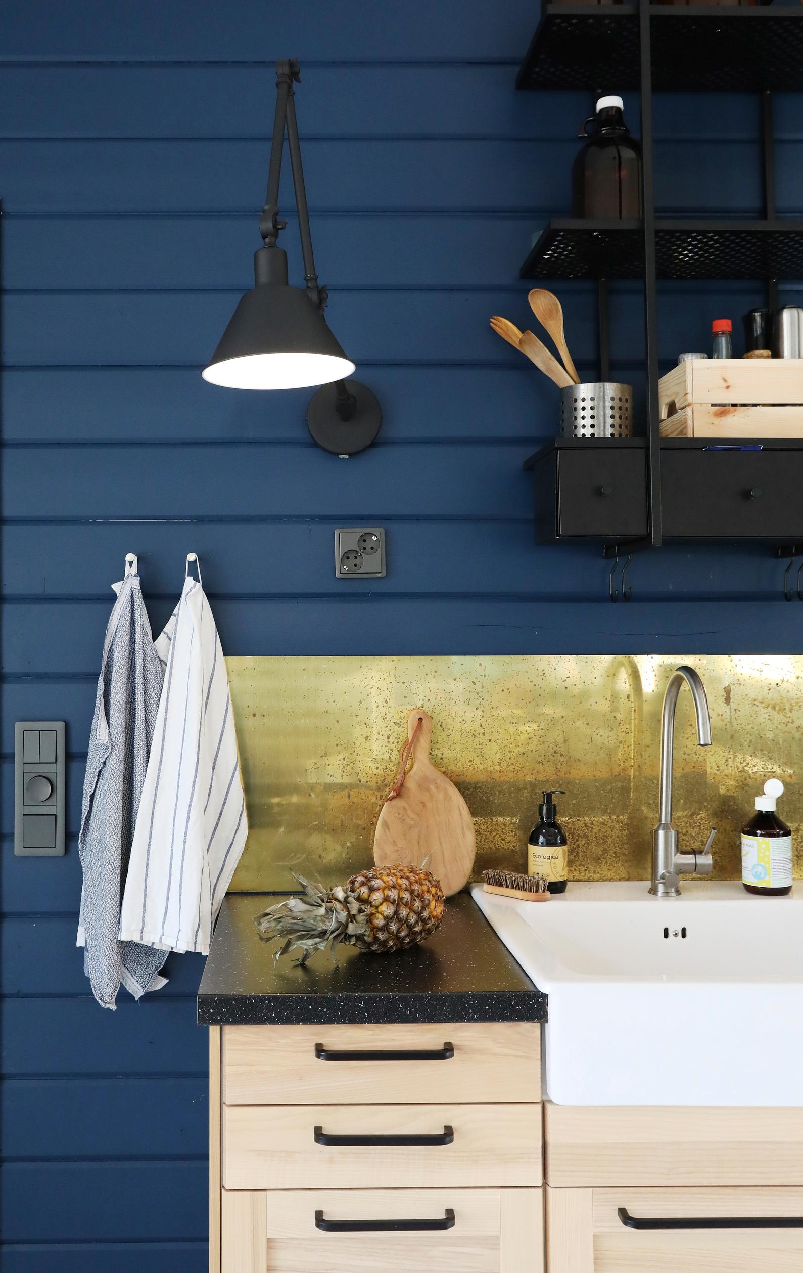 Tässä keittiössä paneloitu lautaseinä on maalattu vuoden trendivärillä. Messingin sävyinen taustalevy on säihkyvä yhdistelmä sinisen seinän kanssa. Sähäkkä väriyhdistelmä, sillä sininen ja keltainen ovat toistensa vastavärejä. Musta seinävalaisin ja hyllykkö antavat viimeisen silauksen persoonalliselle keittiölle.