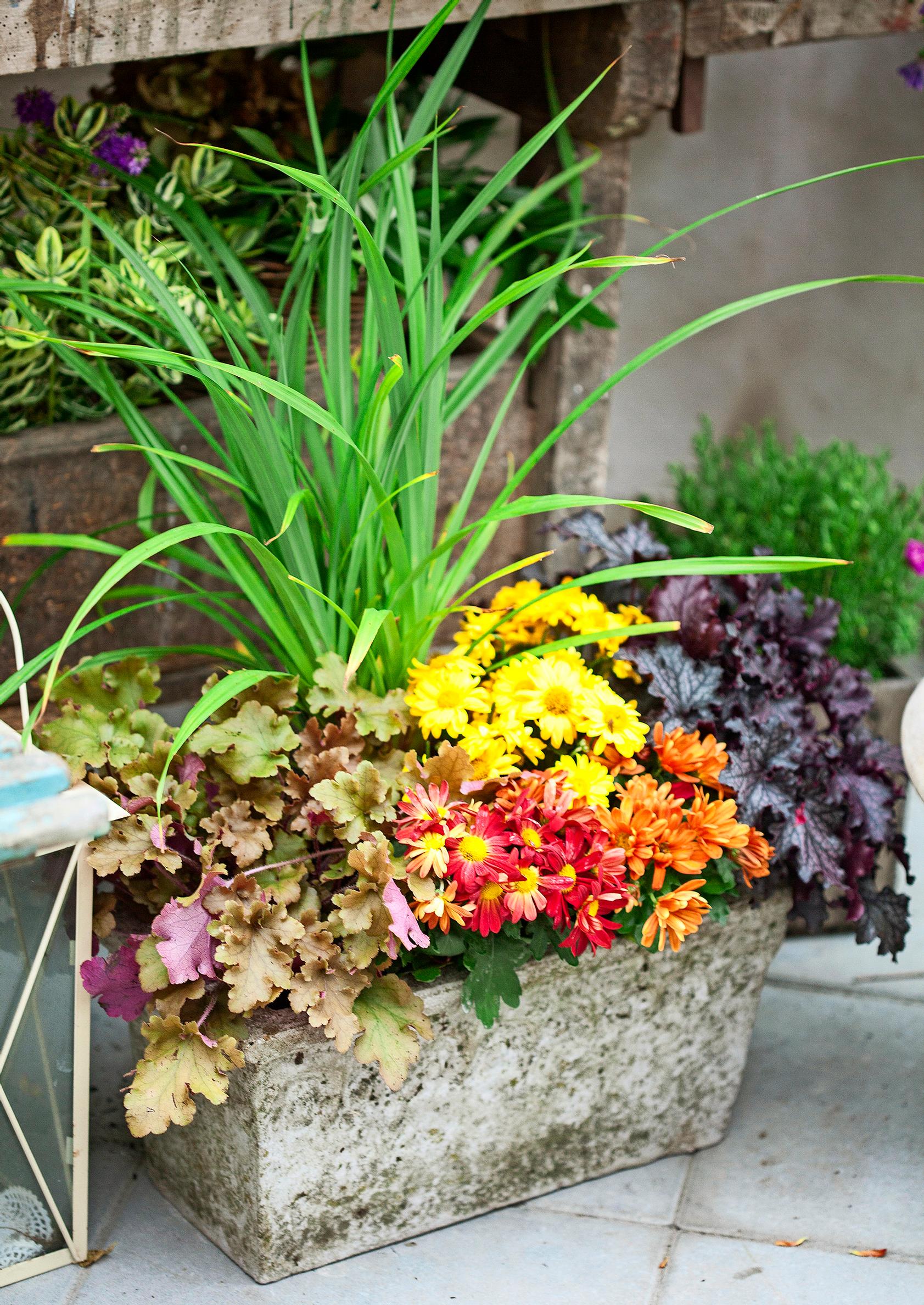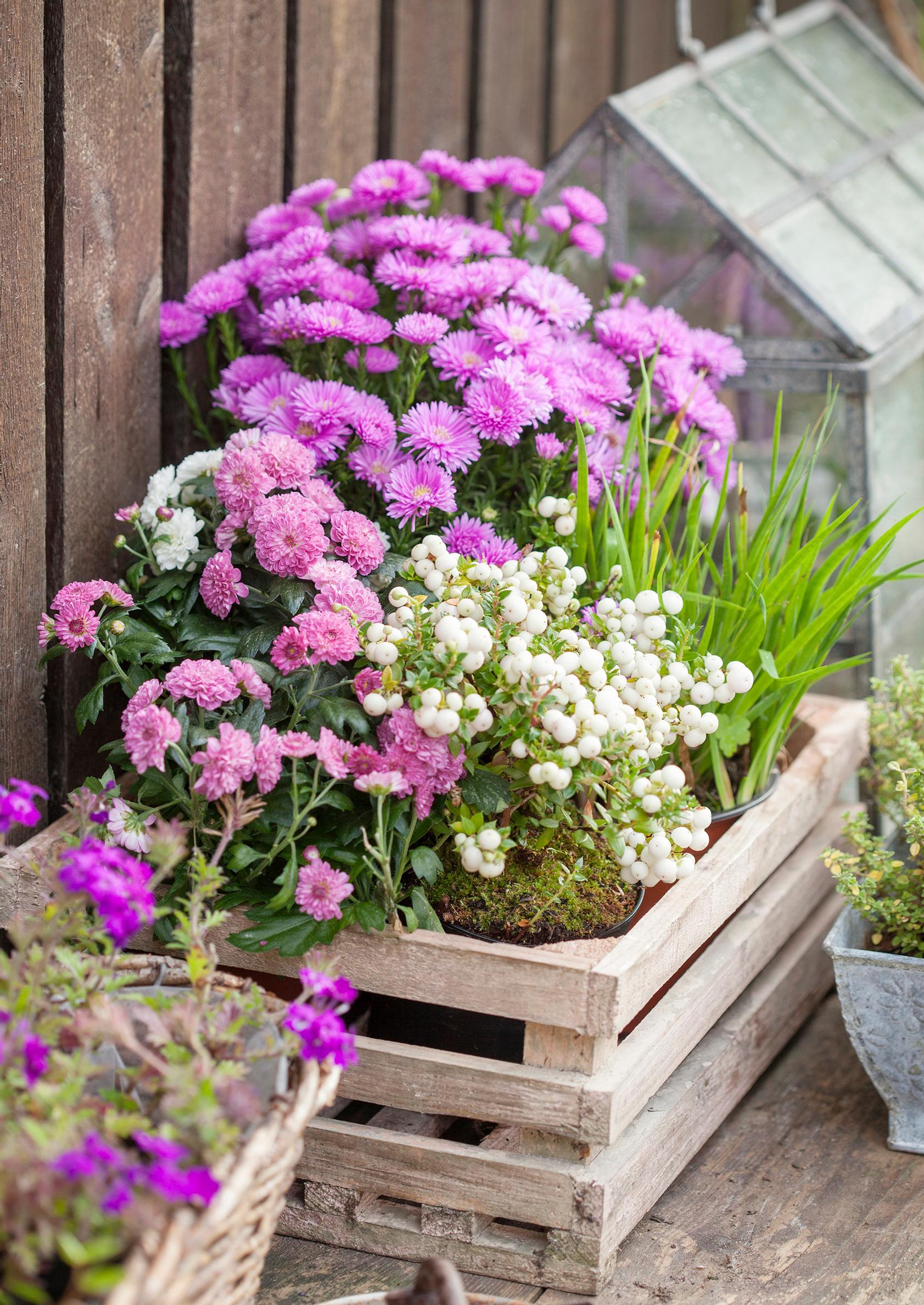 Jos krysanteemit tuntuvat yksinään liian räväköiltä, tasapainota asetelmaa ruukuissa erinomaisesti menestyvillä monivuotisilla tarhakeijunkukilla. Hillityn värinen ruukku tai muu astia viimeistelee istutuksen.