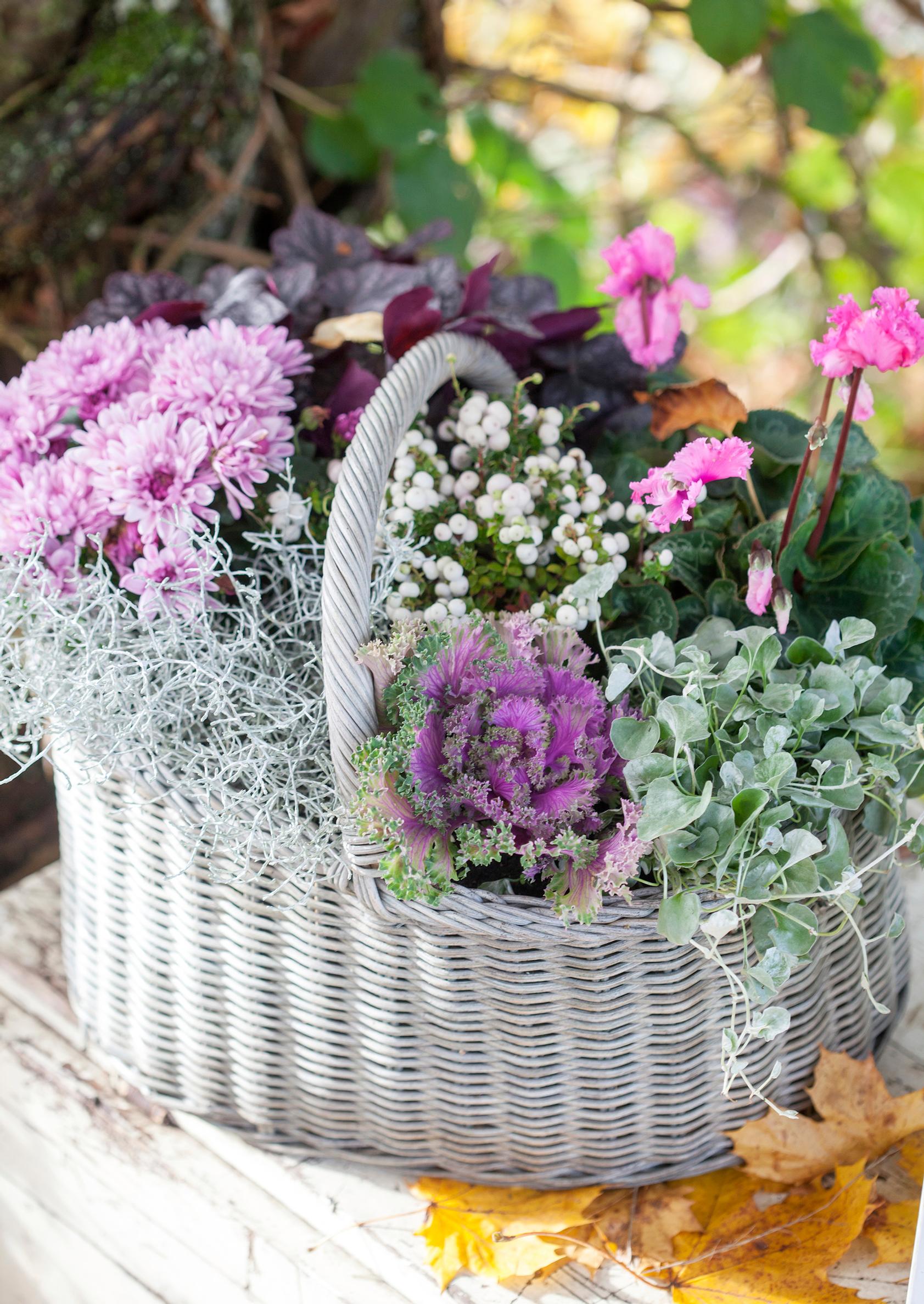Harmaalehtiset ja -versoiset hopealanka ja hopeavitja tuovat pehmeyttä krysanteemin ja koristekaalin ympärille. Hopeavitjan voi pitää astiassa talven yli, sillä versot säilyttävät kauniin hohtonsa jäätyessään ja kuivuessaankin. Myös koristekaali pitää kuosinsa jäätyessään, mutta sulaessaan kasvi pehmenee ja ruskettuu. Valkomarjainen marjakanerva (Pernettya mucronata) on melko uusi tuttavuus syyskasvina. Se kaipaa säännöllistä kastelua, jotta lehdet eivät karise. Leutona talvena kasvi voi selvitä kevääseen asti. Marjakanervasta on myös puna- ja pinkkimarjaisia lajikkeita.