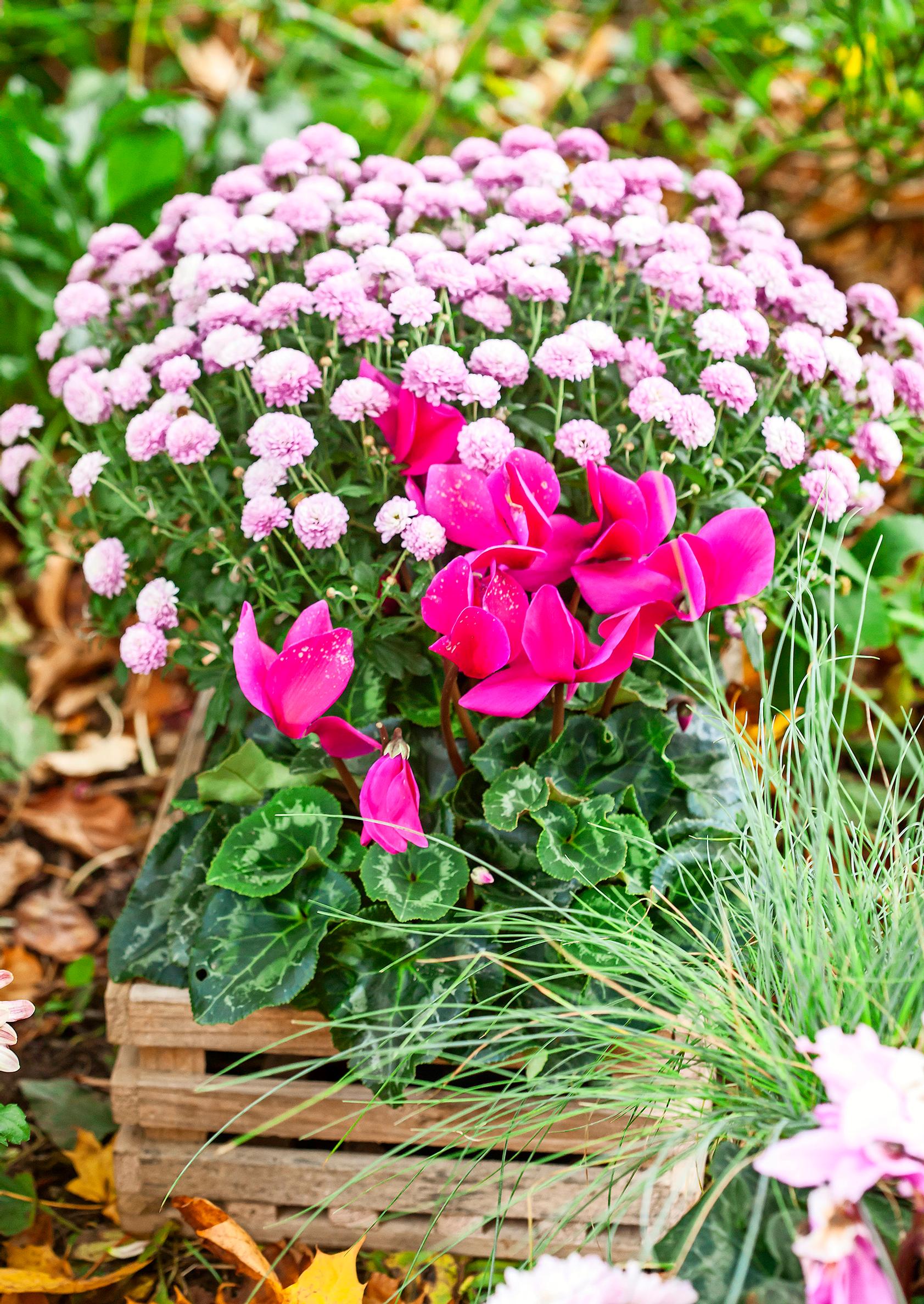 Pallokrysanteemi ja syklaami ovat hyvä pari, sillä molemmat viihtyvät viileässä ja valoisassa paikassa sekä kaipaavat säännöllistä kastelua. Pakkasilta isokukkaiset krysanteemit ja karaisemattomat syklaamit kannattaa nostaa suojaan. Pienikukkaiset Multiflorat ja kylmään tottuneet syklaamit eivät sen sijaan hätkähdä, jos lämpötila käväisee nollan alapuolella.