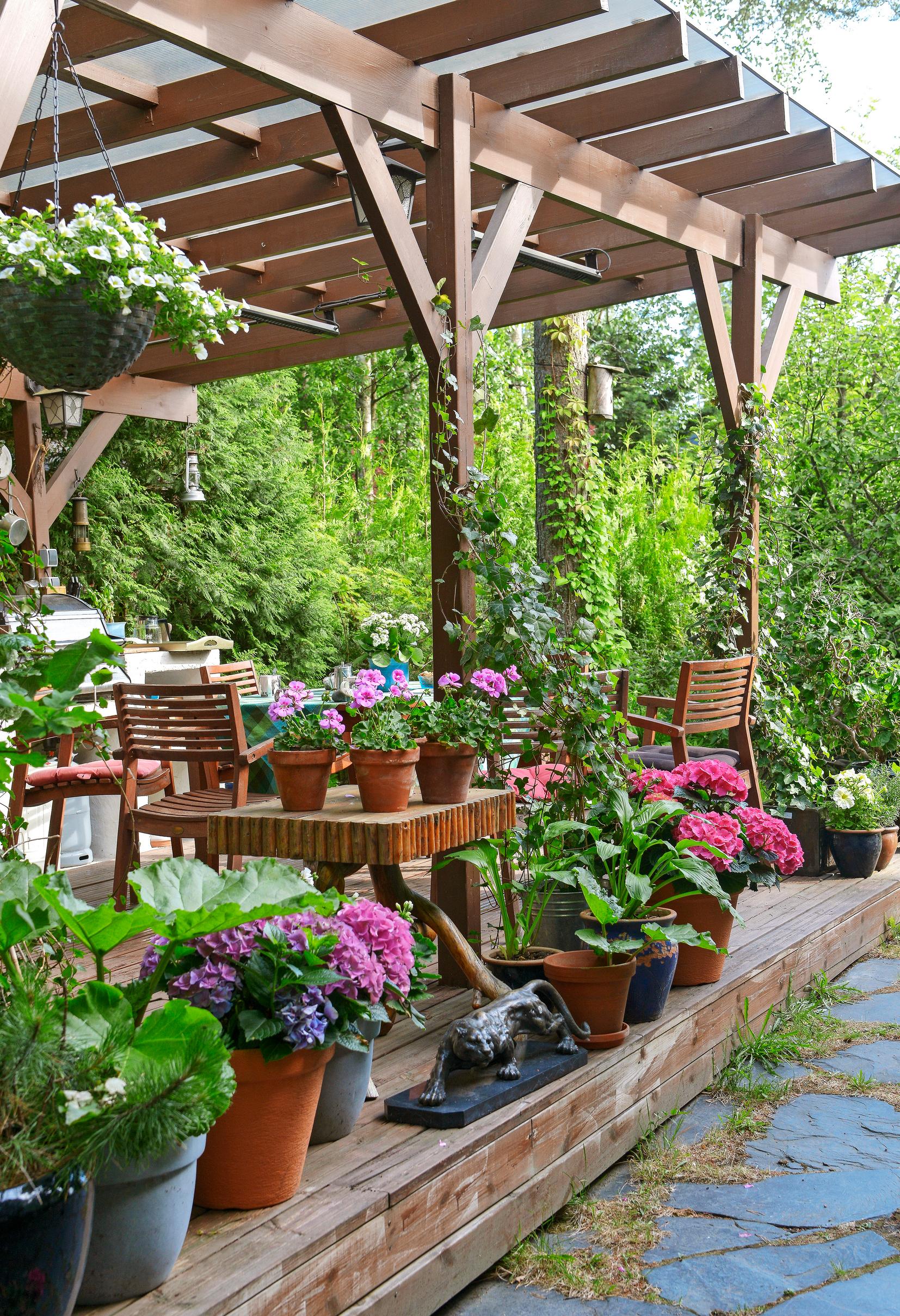 Päivi ja Riku Lumiaron kaupunkipihan terassimainen pergola on sopiva paikka ihastella pioneja ja tarkkailla viereisen pihalammikon elämää.