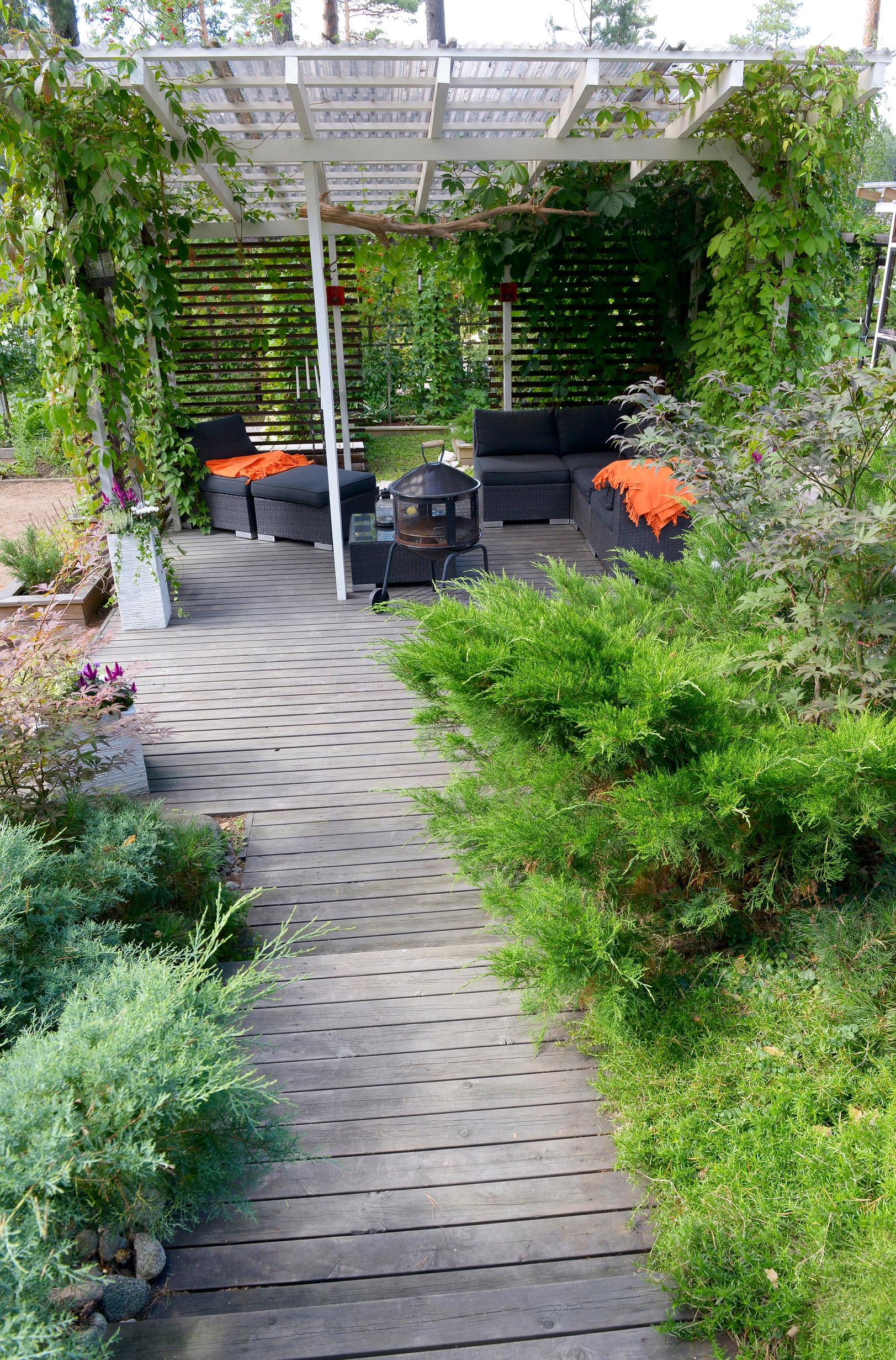 Puisen terassikannen päälle perustettu pergola on viihtyisä puutarhahuone. Tasaisella alustalla puutarhakalusteet pysyvät tukevasti pystyssä ja niitä on helppo liikutella. Pergola sekä terassin läpi kasvava omenapuu muodostavat ilmavan katon, joka ei kuitenkaan estä auringonsäteitä.