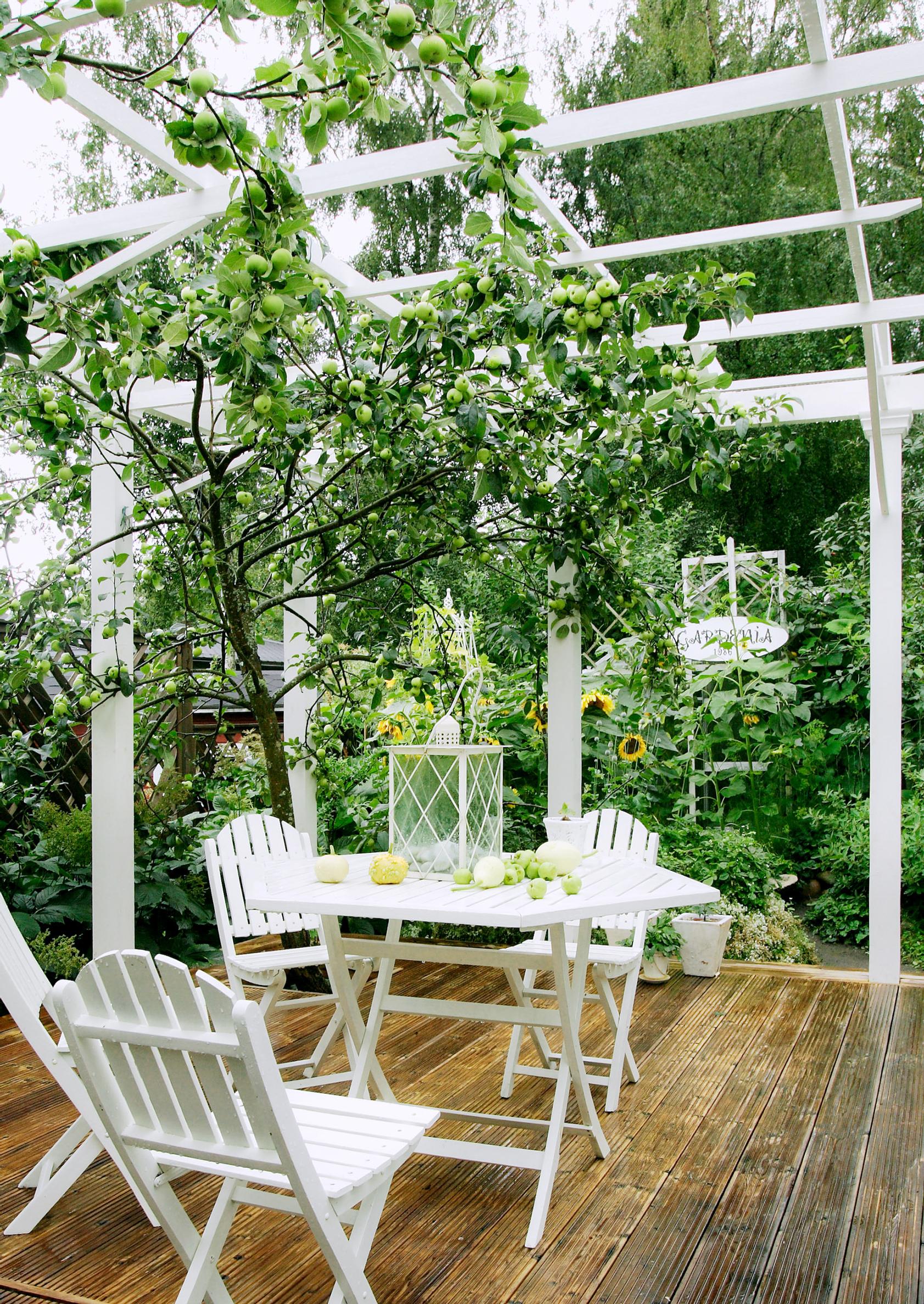 2. Valkoiseksi maalattu pergola suorastaan loistaa vihreän keskeltä